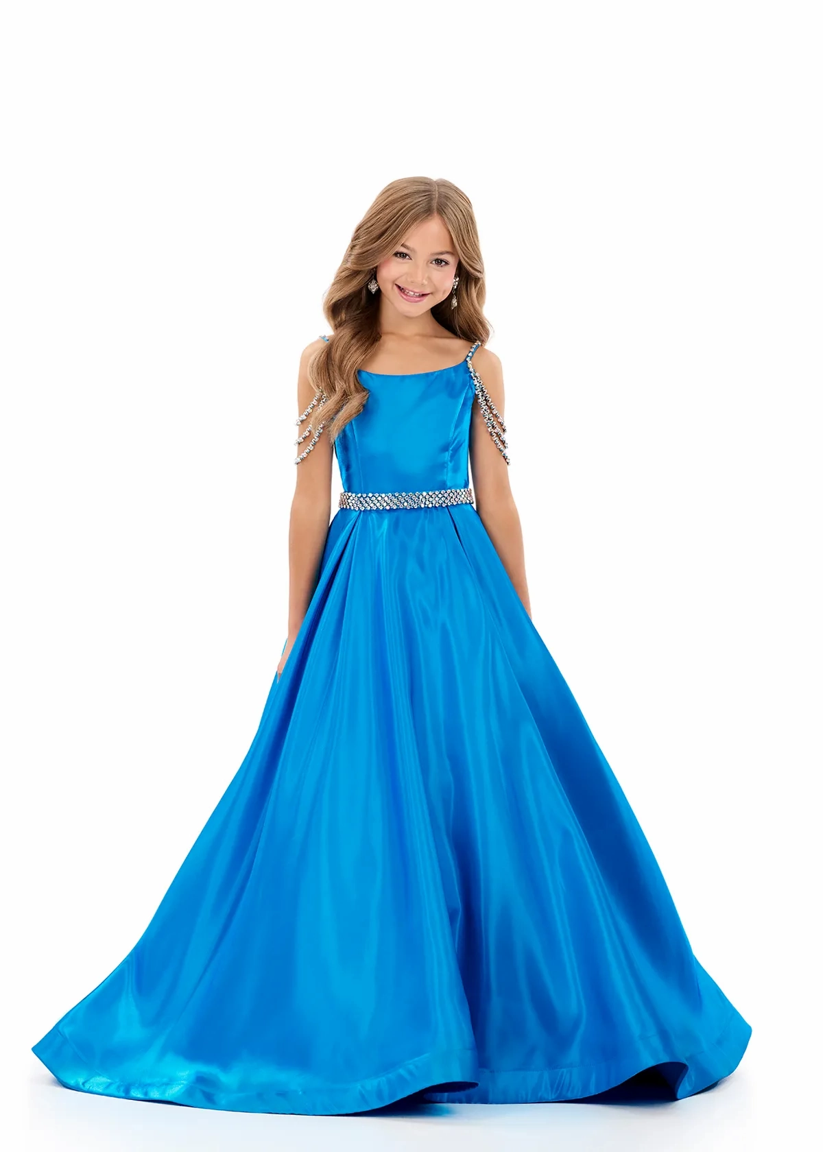 Make a grand entrance in this stunning ASHLEYlauren Kids Satin Ball Gown. This exquisite gown features a sleek square neckline complemented by crystal fringe straps that add a touch of sparkle and movement. The beaded waistband accentuates the waist beautifully, while the full satin skirt flows into a dramatic train that ensures a show-stopping look for any special occasion.
