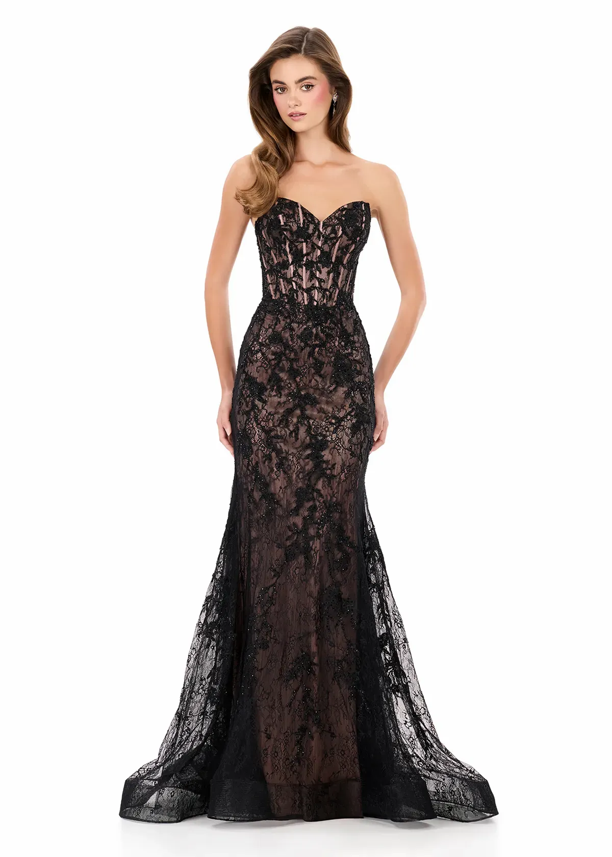 This unique stunning off-shoulder lace gown is sure to make a grand entrance. The fitted silhouette of ASHLEYlauren Style 12081 is adorned with intricate lace and appliqué detailing that glimmers with every movement. The sheer fingerless gloves and structured bodice add a touch of sophistication, while the dramatic sweep train ensures an unforgettable entrance at your next event. Perfect for pageants, galas, or red-carpet moments, this gown combines elegance with modern allure.