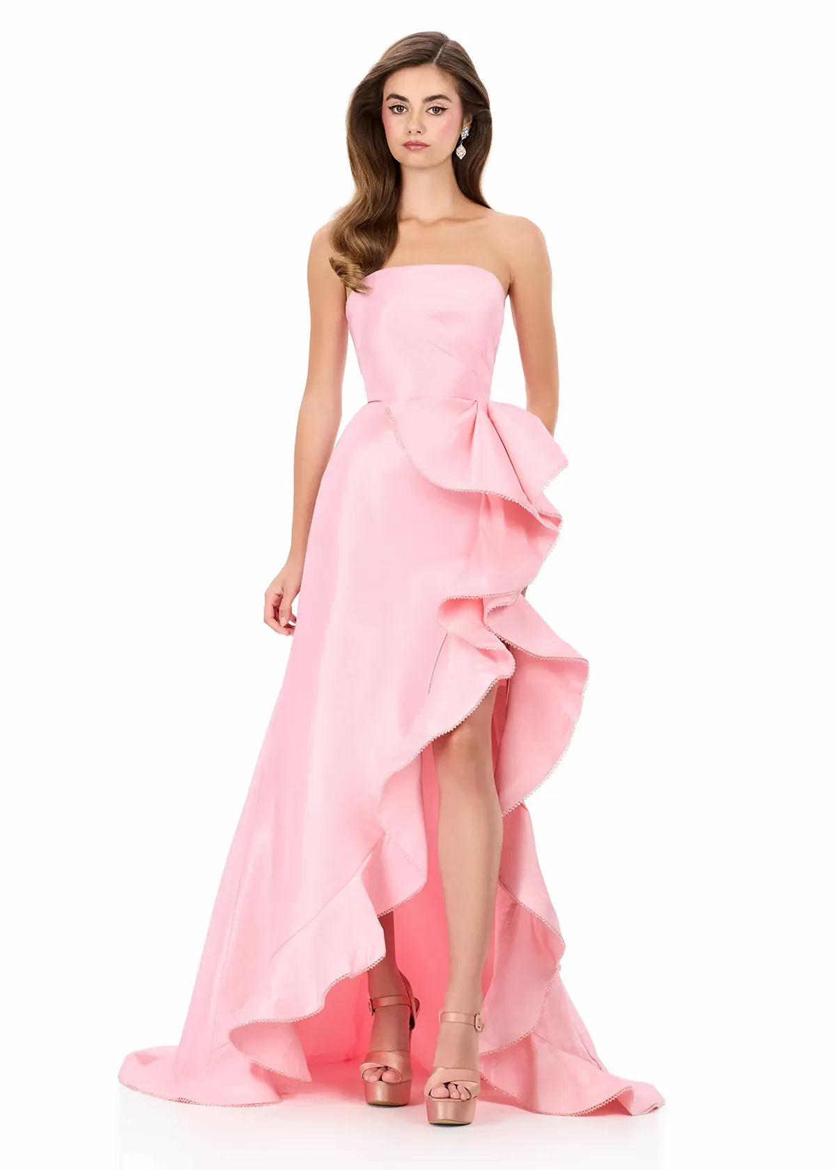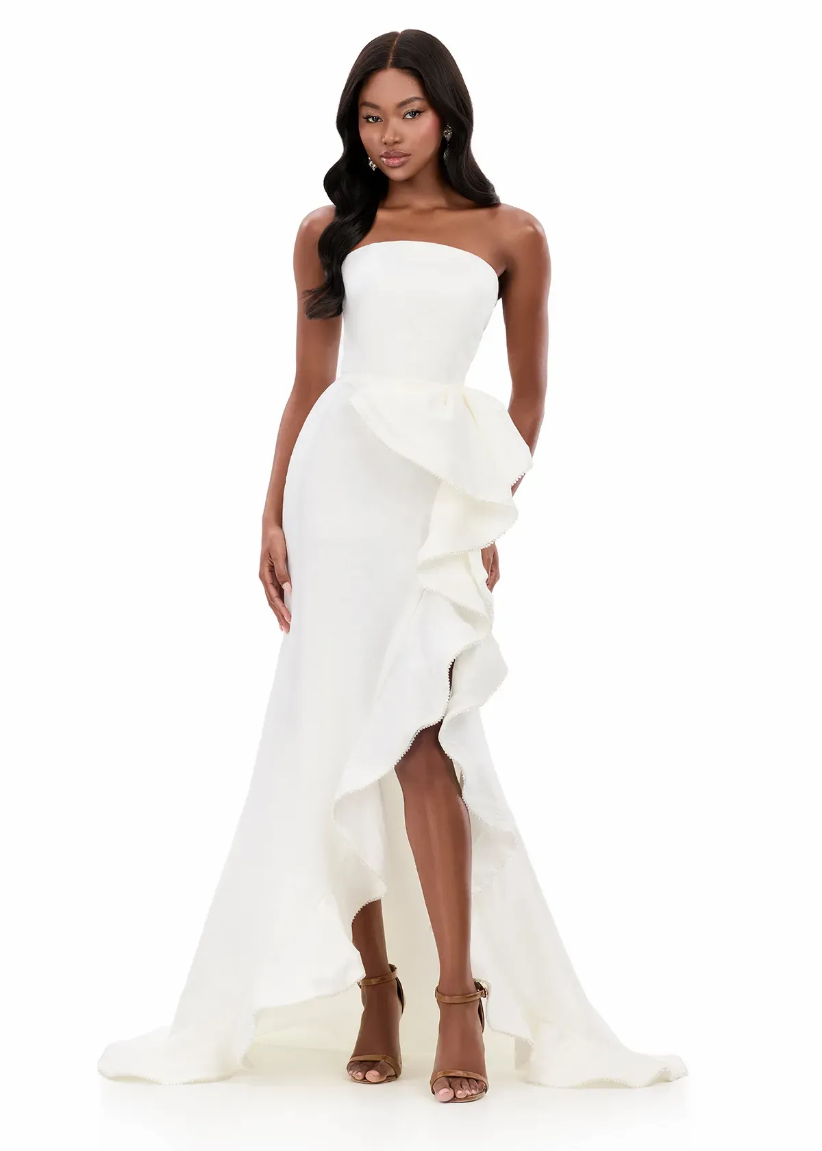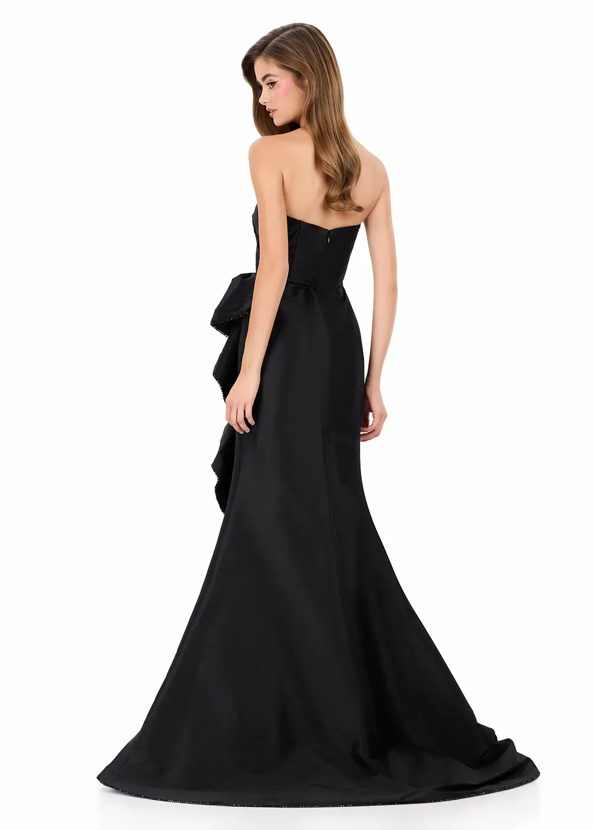 Effortlessly dramatic this gown features a clean strapless neckline paired with a voluminous ruffle cascading down the skirt for a bold, fashion-forward moment. ASHLEYlauren Style 12309 is crafted from rich taffeta. This gown offers structure, shine, and movement—making it perfect for anyone wanting a modern yet timeless statement silhouette.