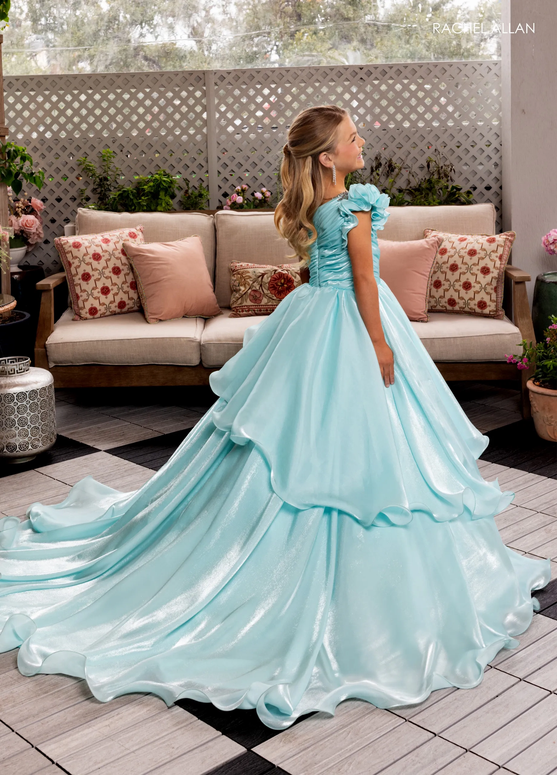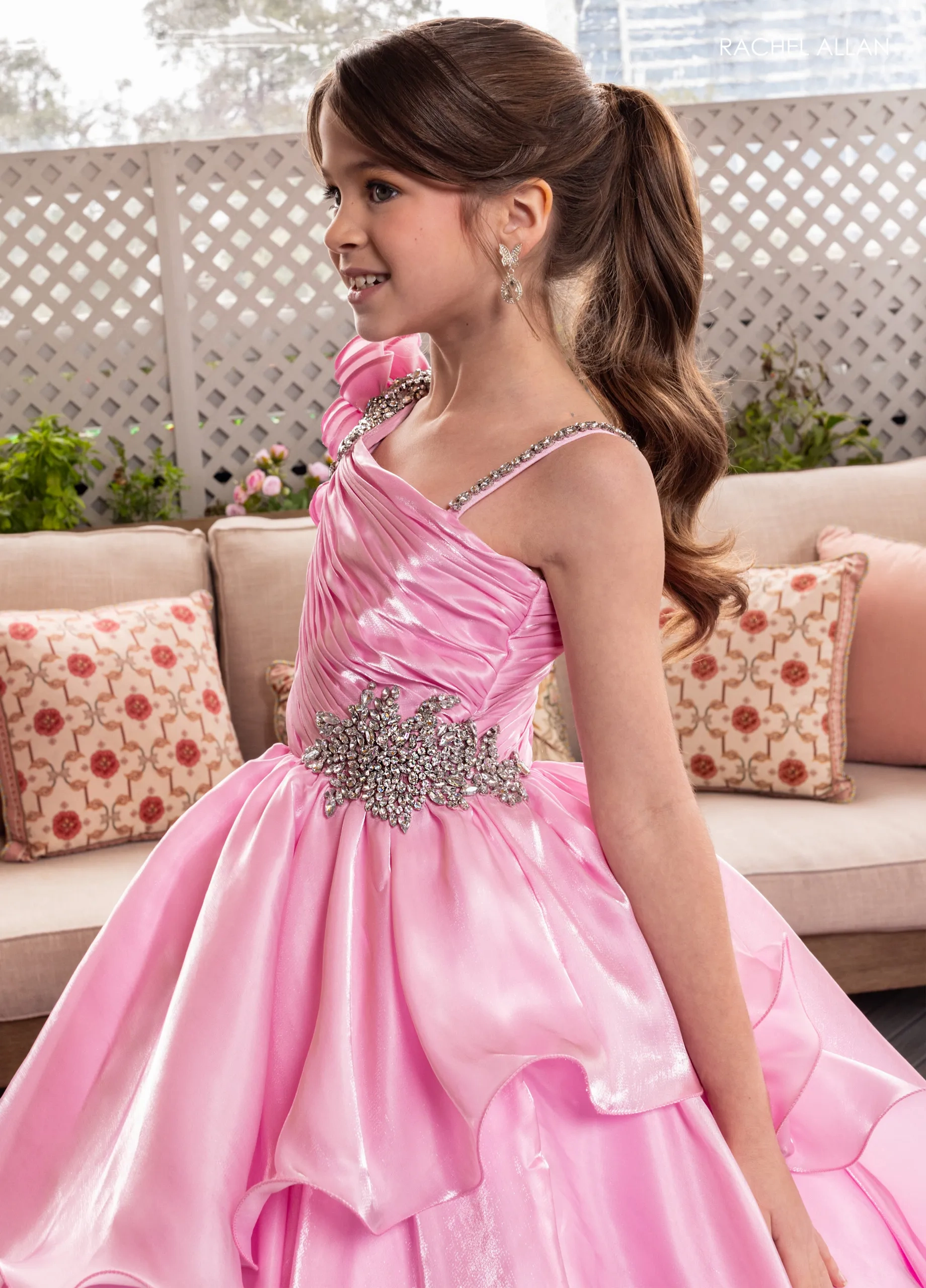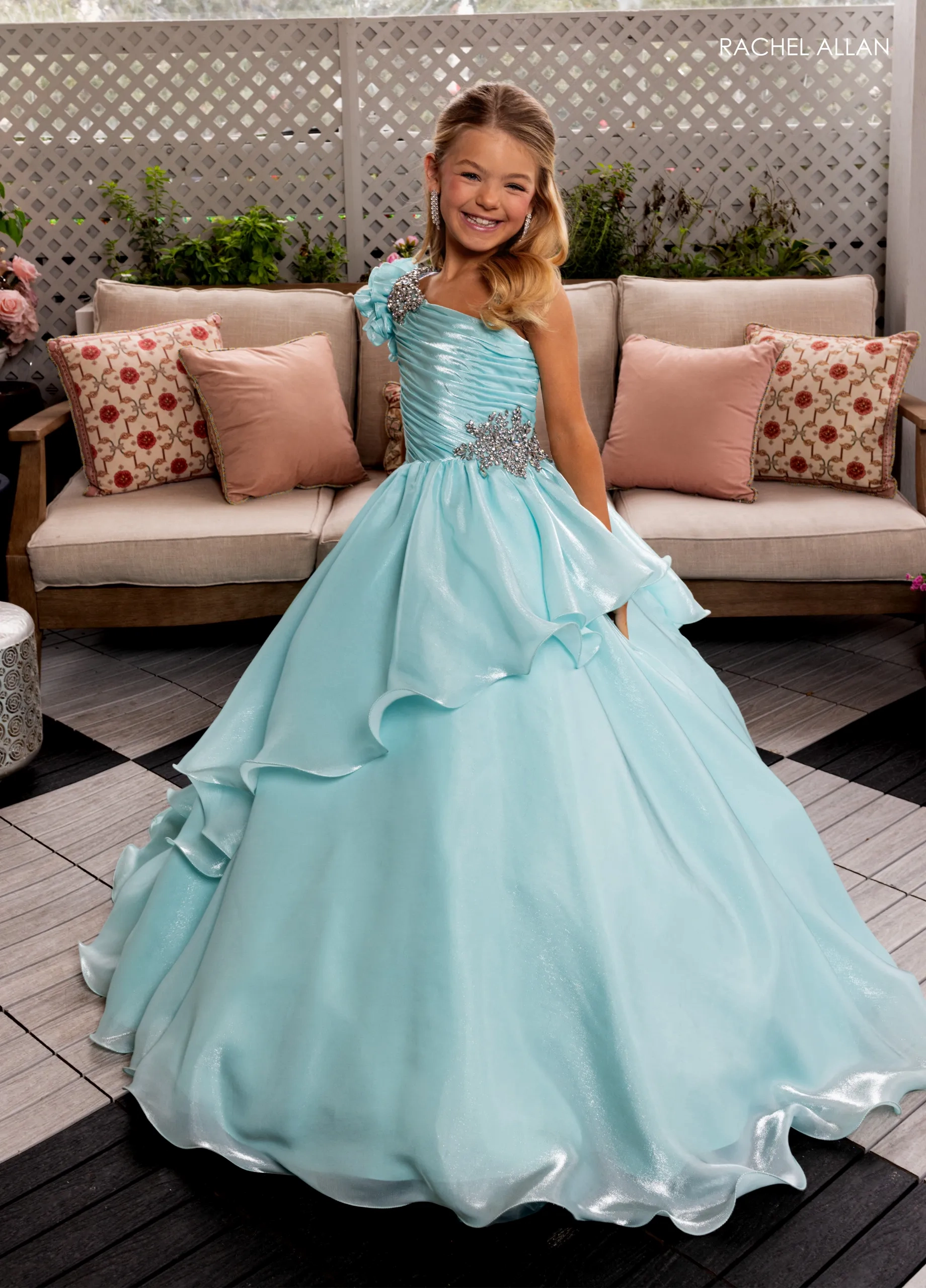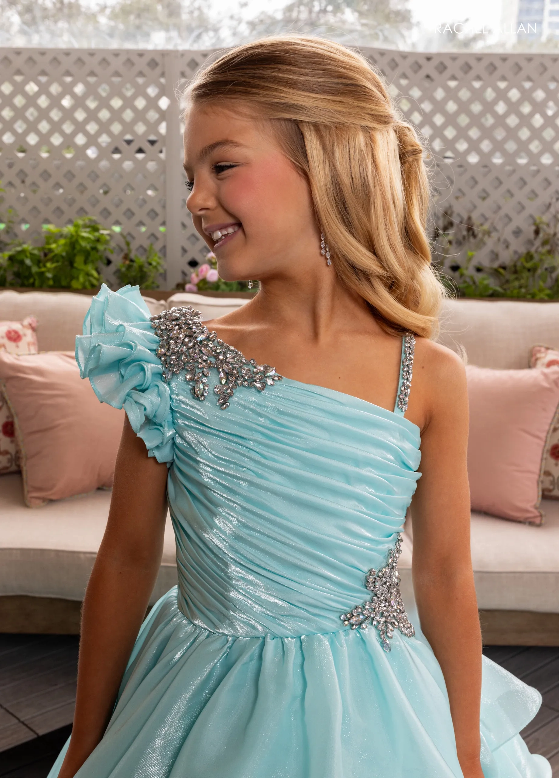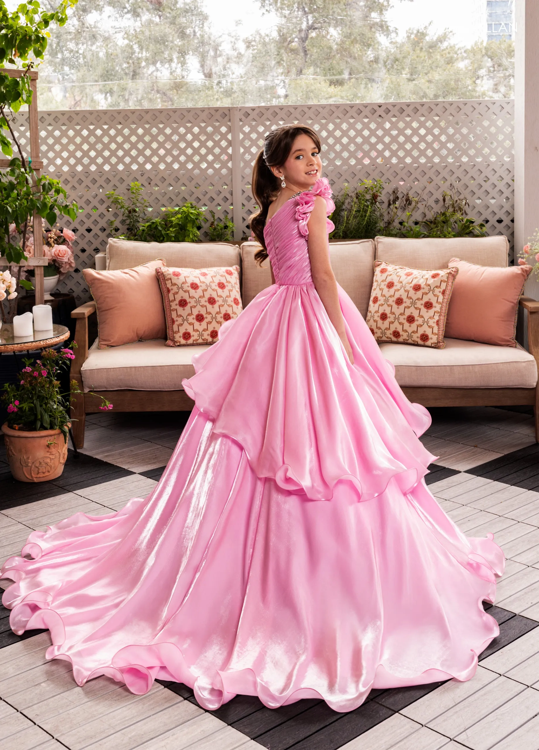 Style 10281 is a princess-perfect gown crafted in luminous crystal organza with delicate crystal beading. The one-shoulder bodice features soft ruching and floral appliqué, while cascading layers create an ethereal silhouette. A sparkling waist detail adds the final touch, making this a magical look for birthdays, pageants, and portraits. Also available in mint.