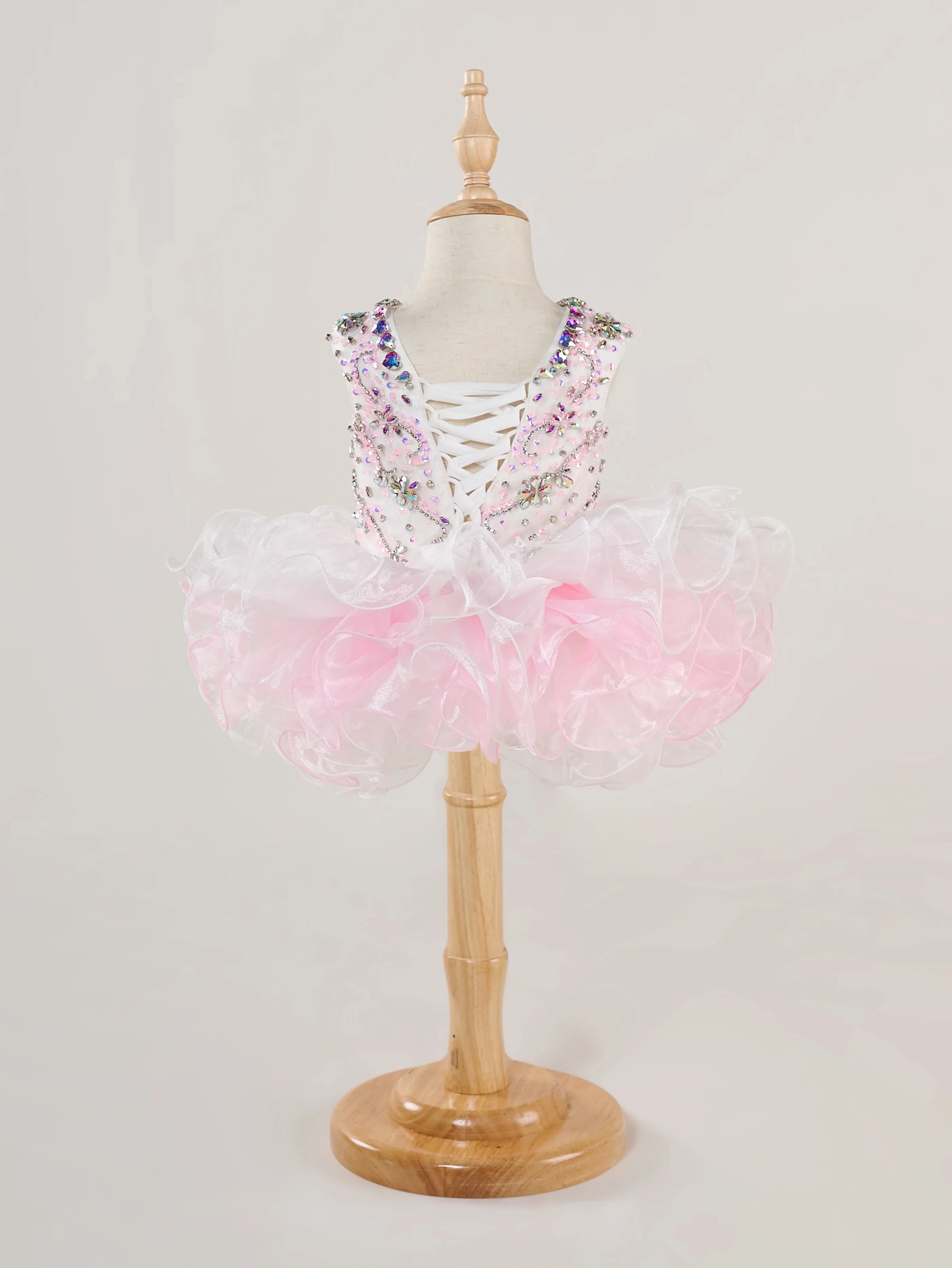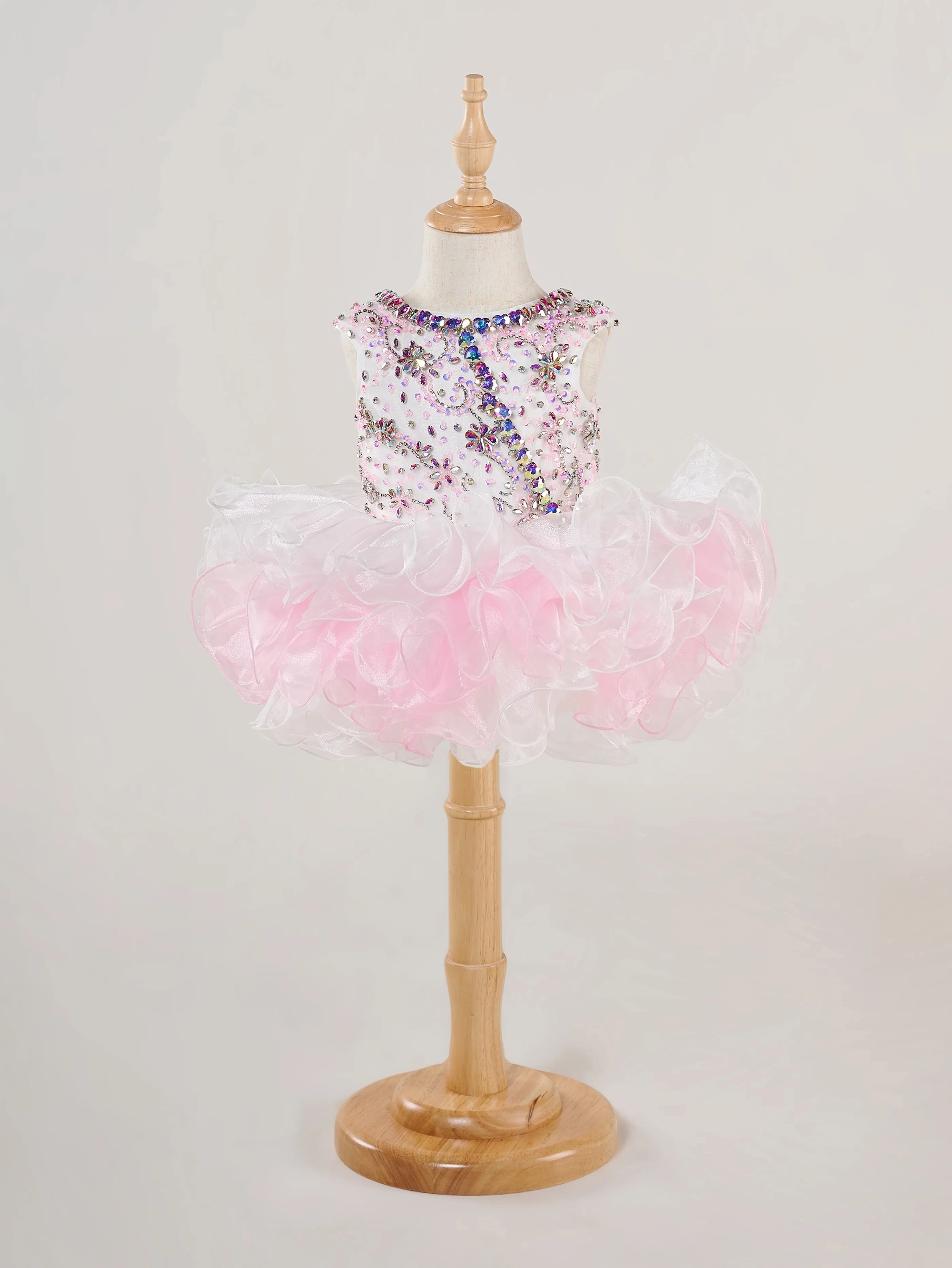 Scoop neck, cap sleeve dress in pink and white with bicolor beading.