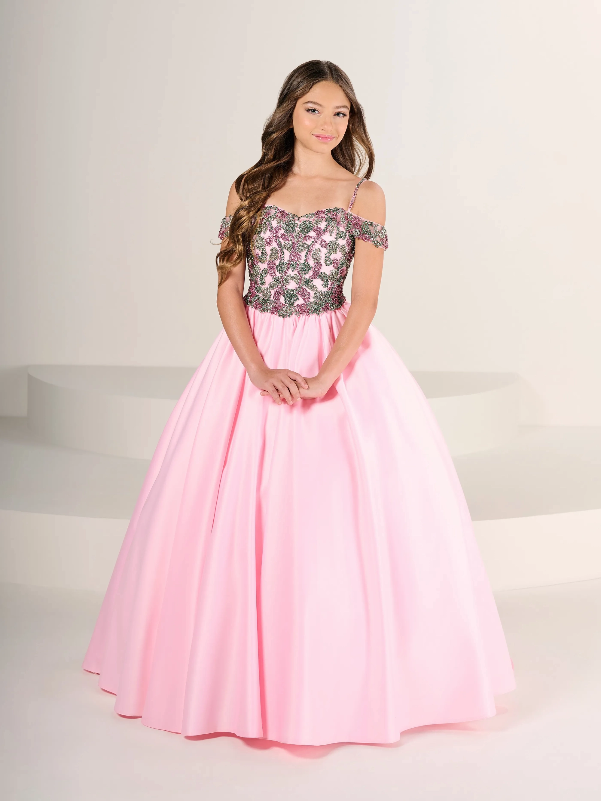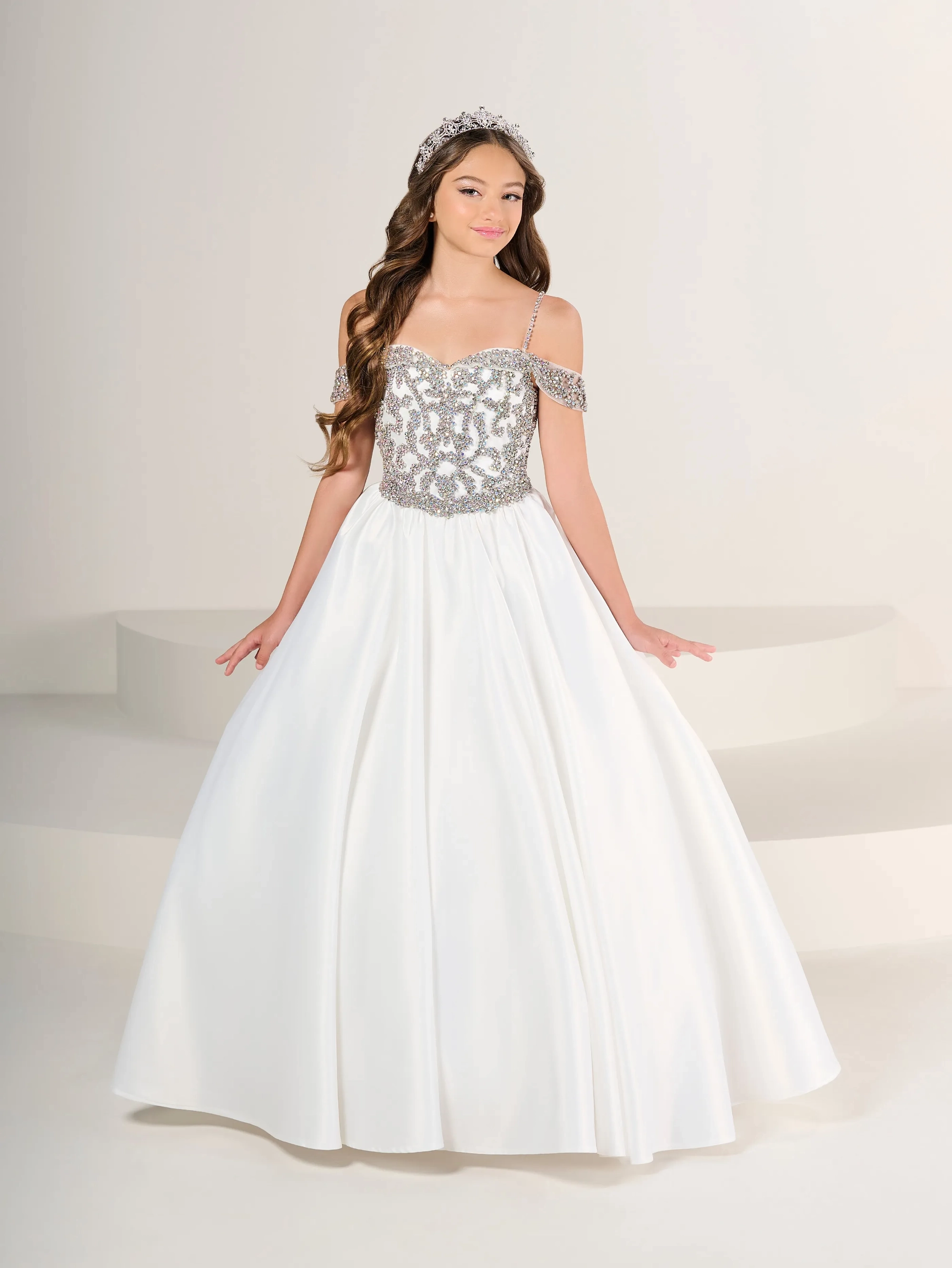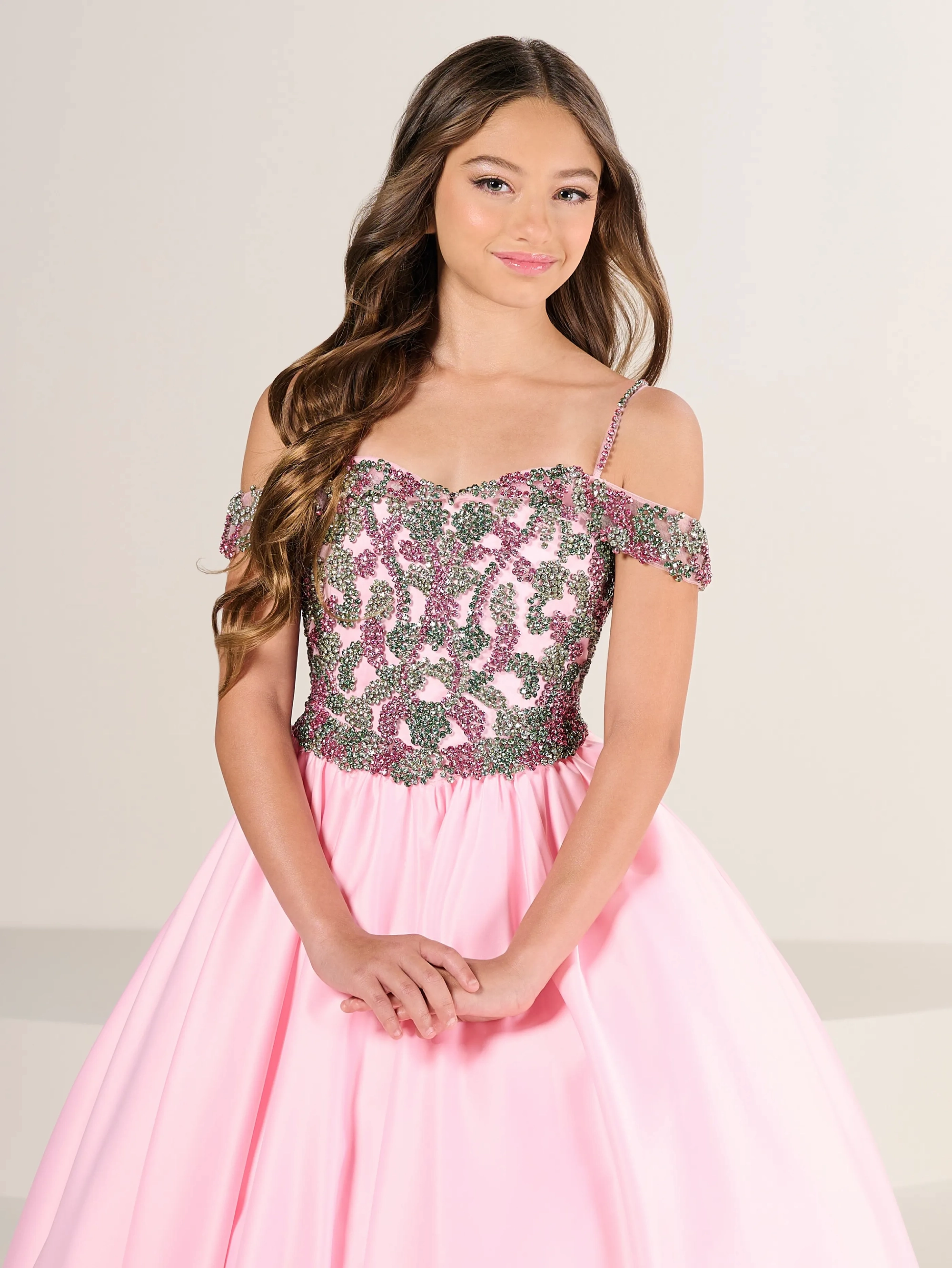 Off shoulder satin gown with an all-glass beaded bodice is a showstopper.