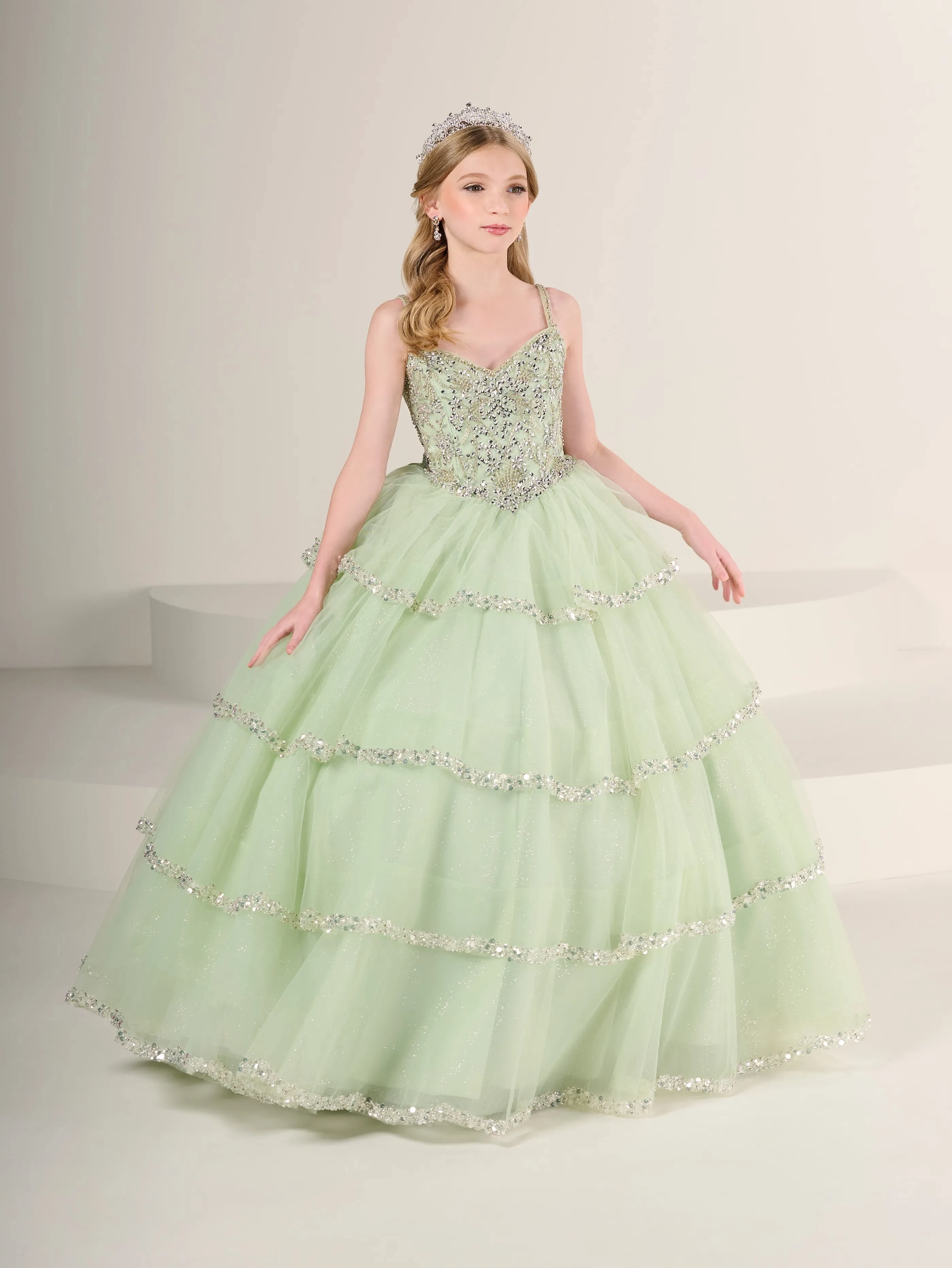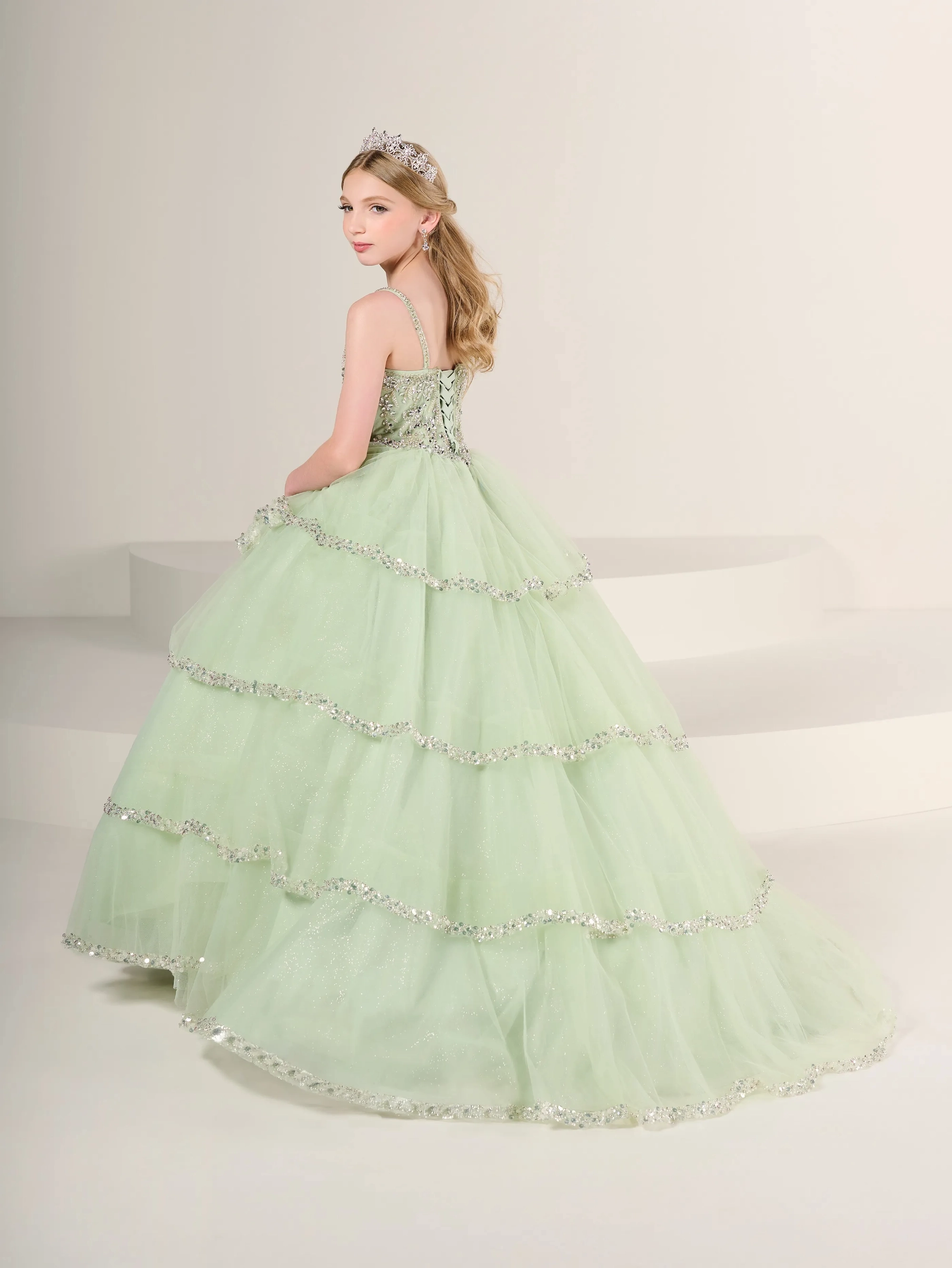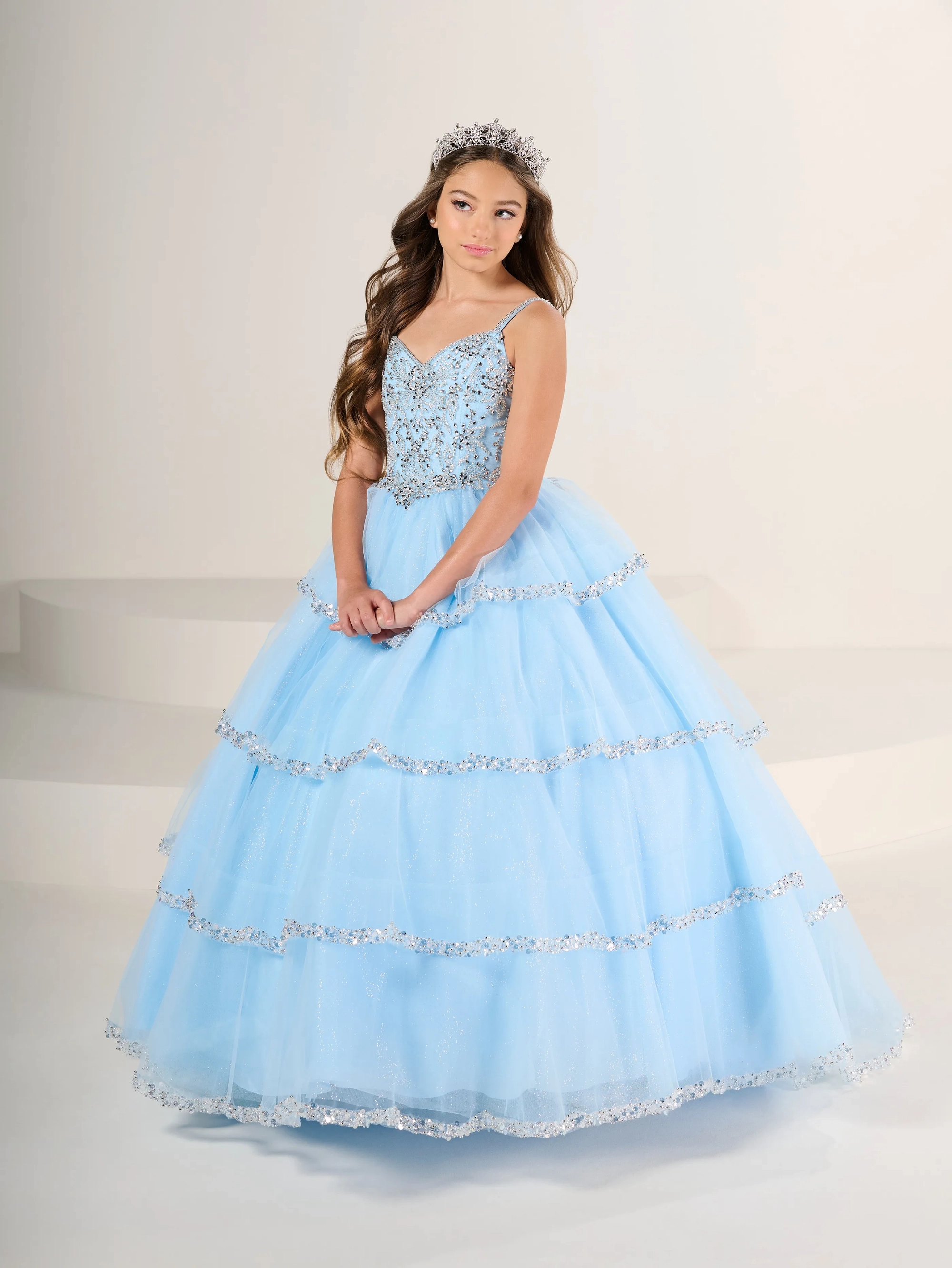 A stunning basque waist gown that is perfectly accented with a layered tulle skirt that has delicate beading on the edge of each layer.