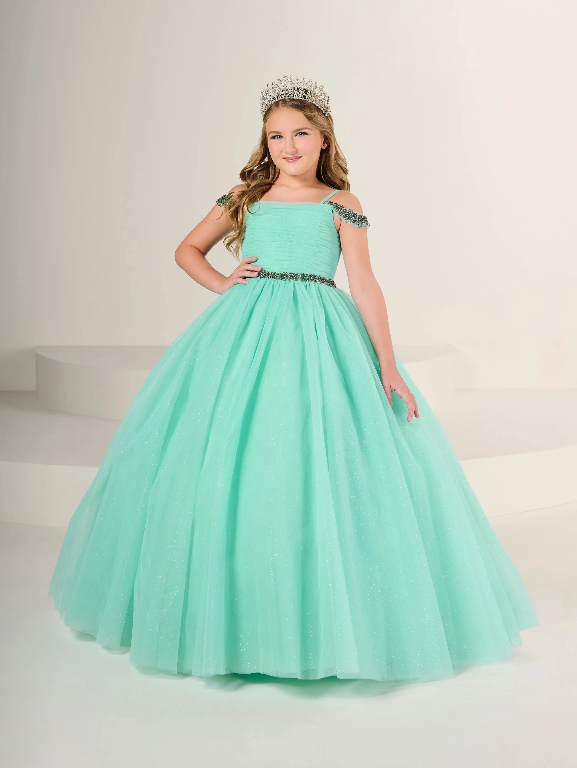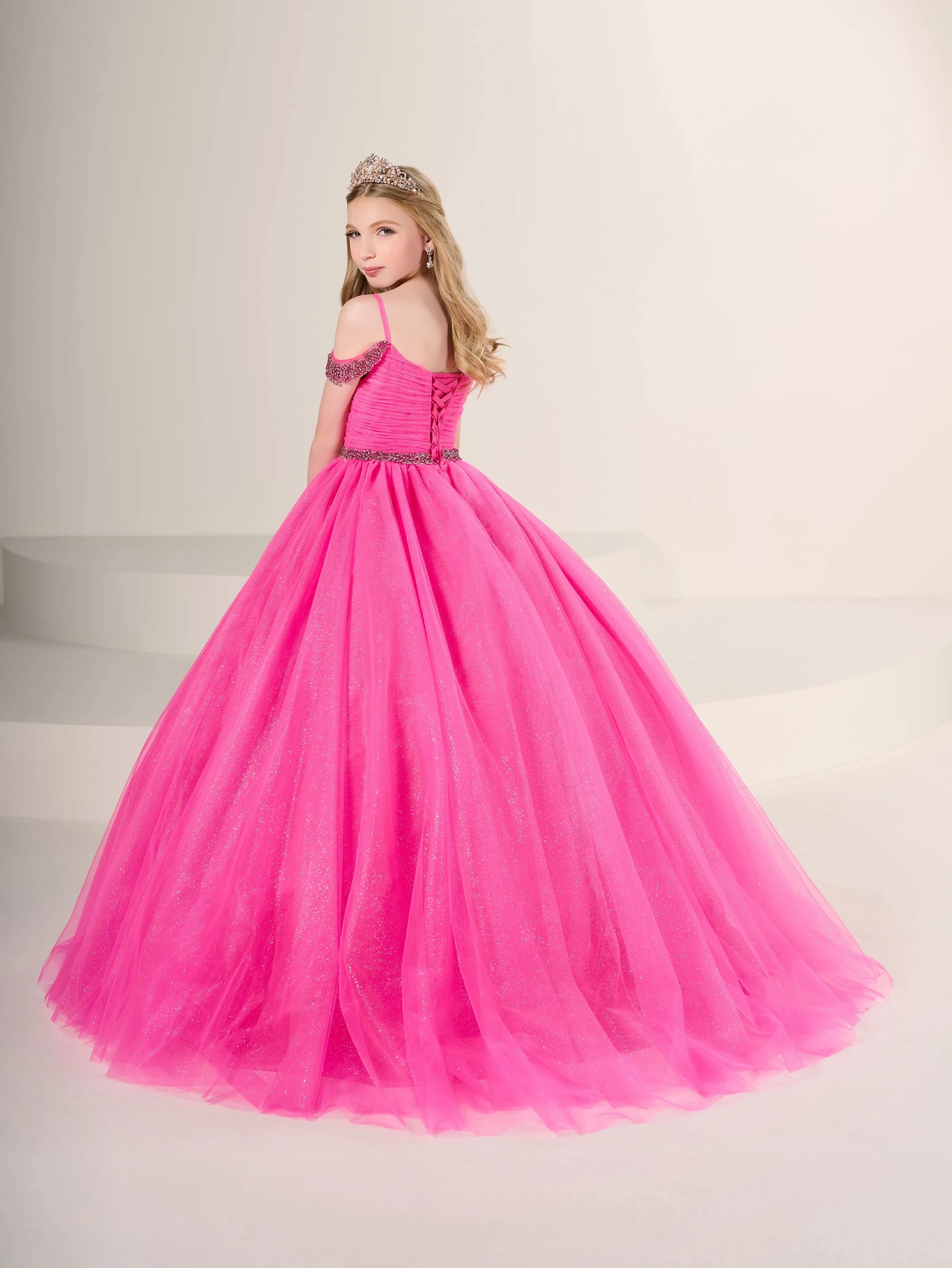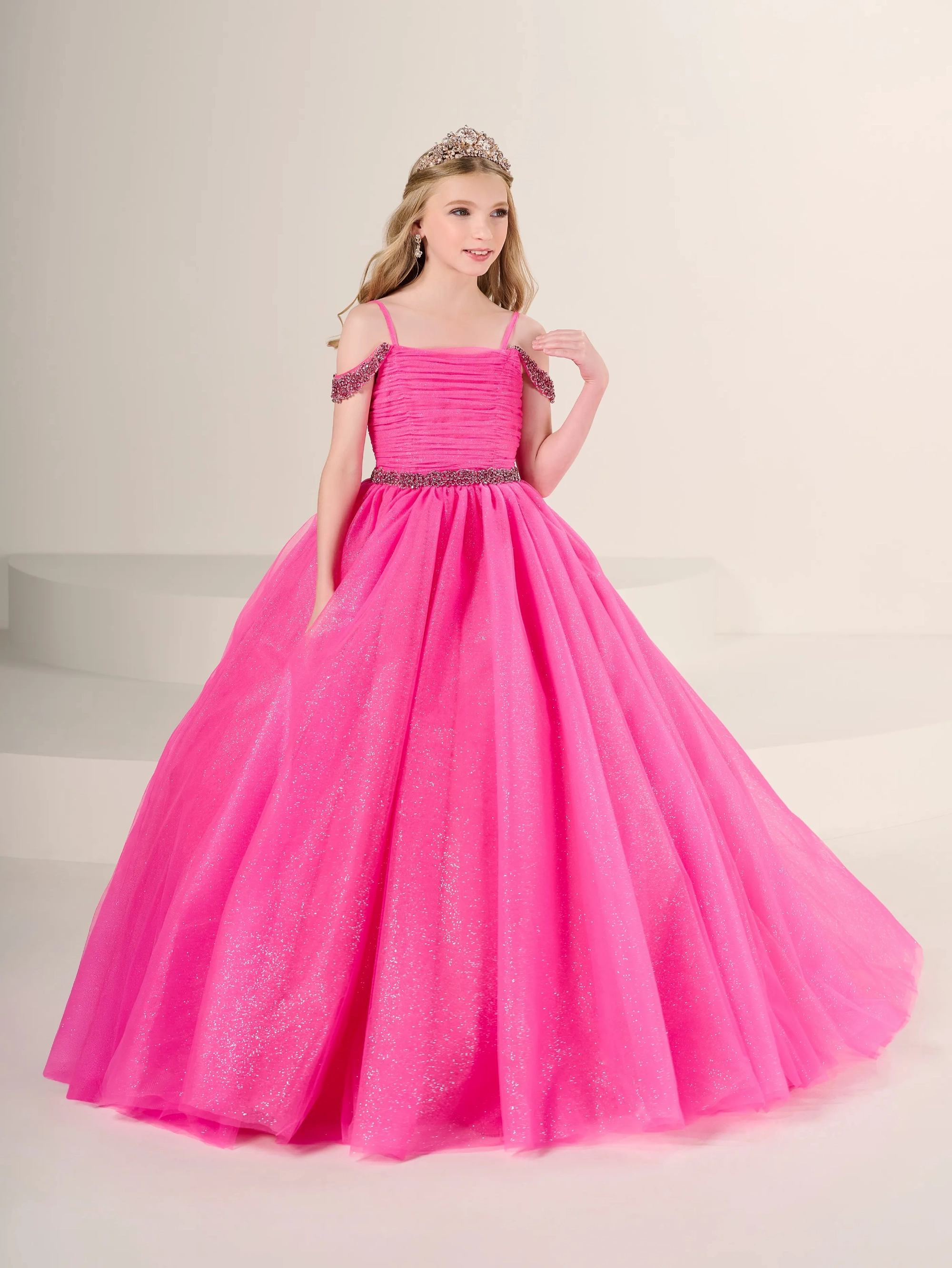 Ruched bodice dress with beaded belt and arm drape falling into a full sparkle tulle skirt.