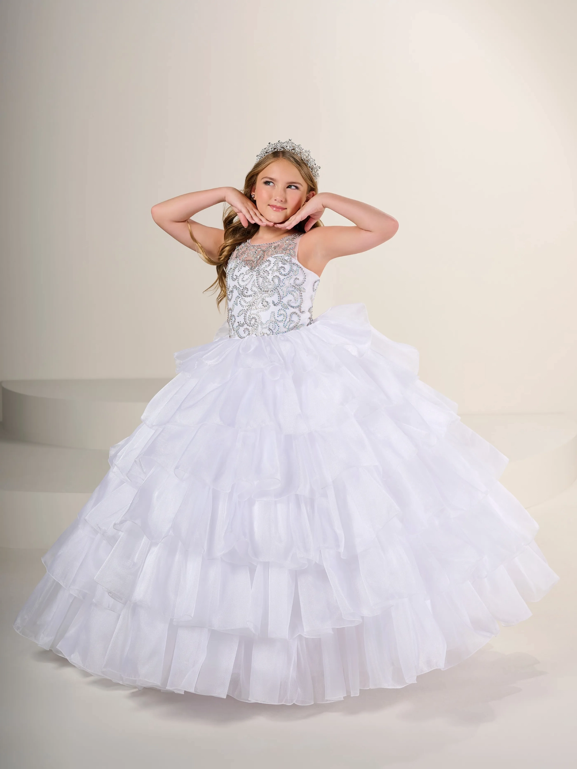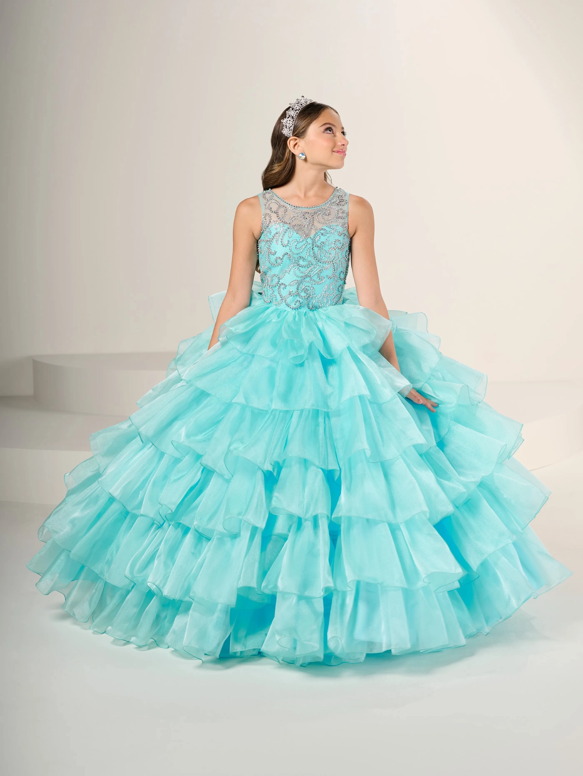 Sweetheart neckline with illusion overlay finishes with a multi-layered full organza skirt.