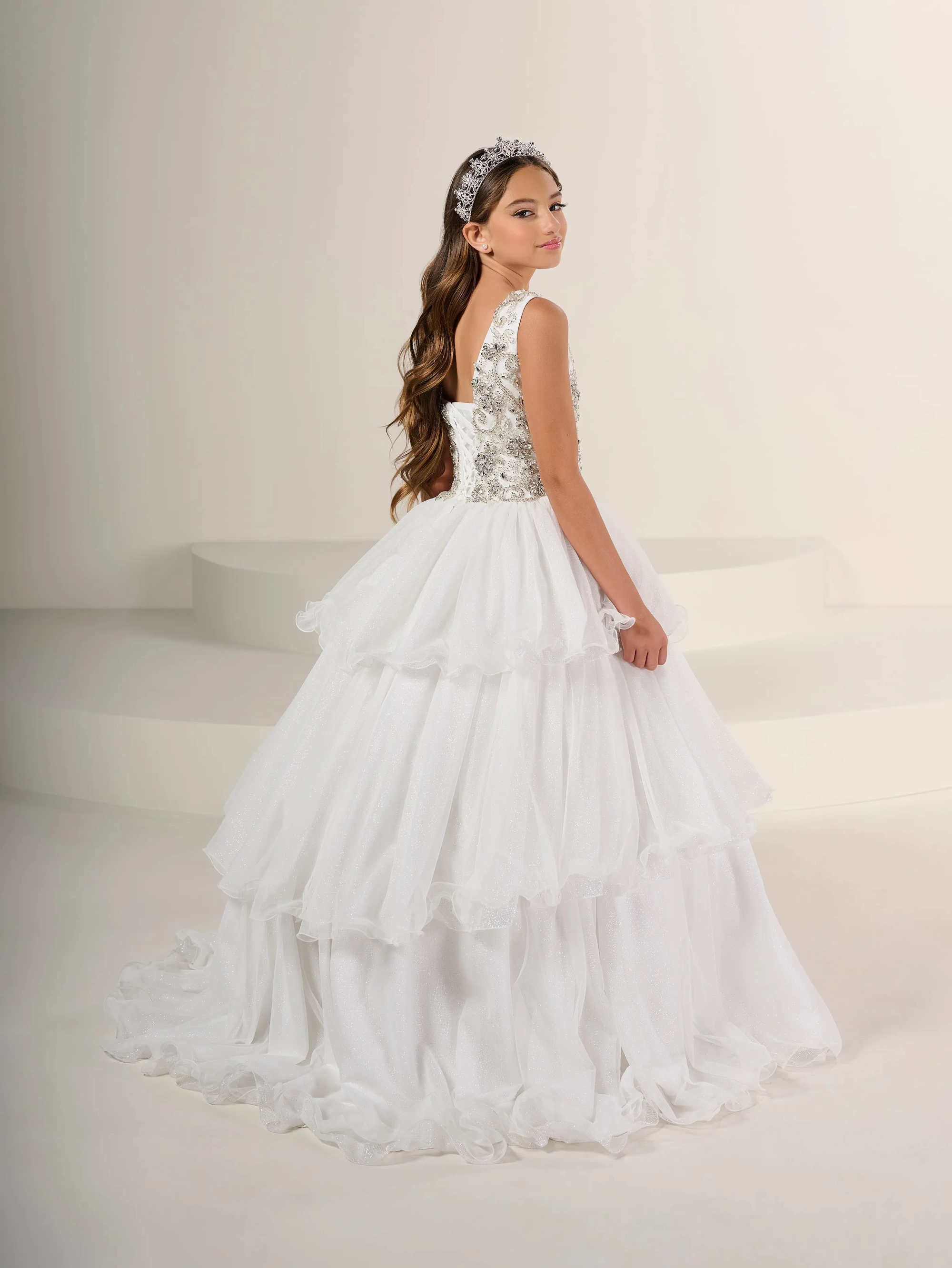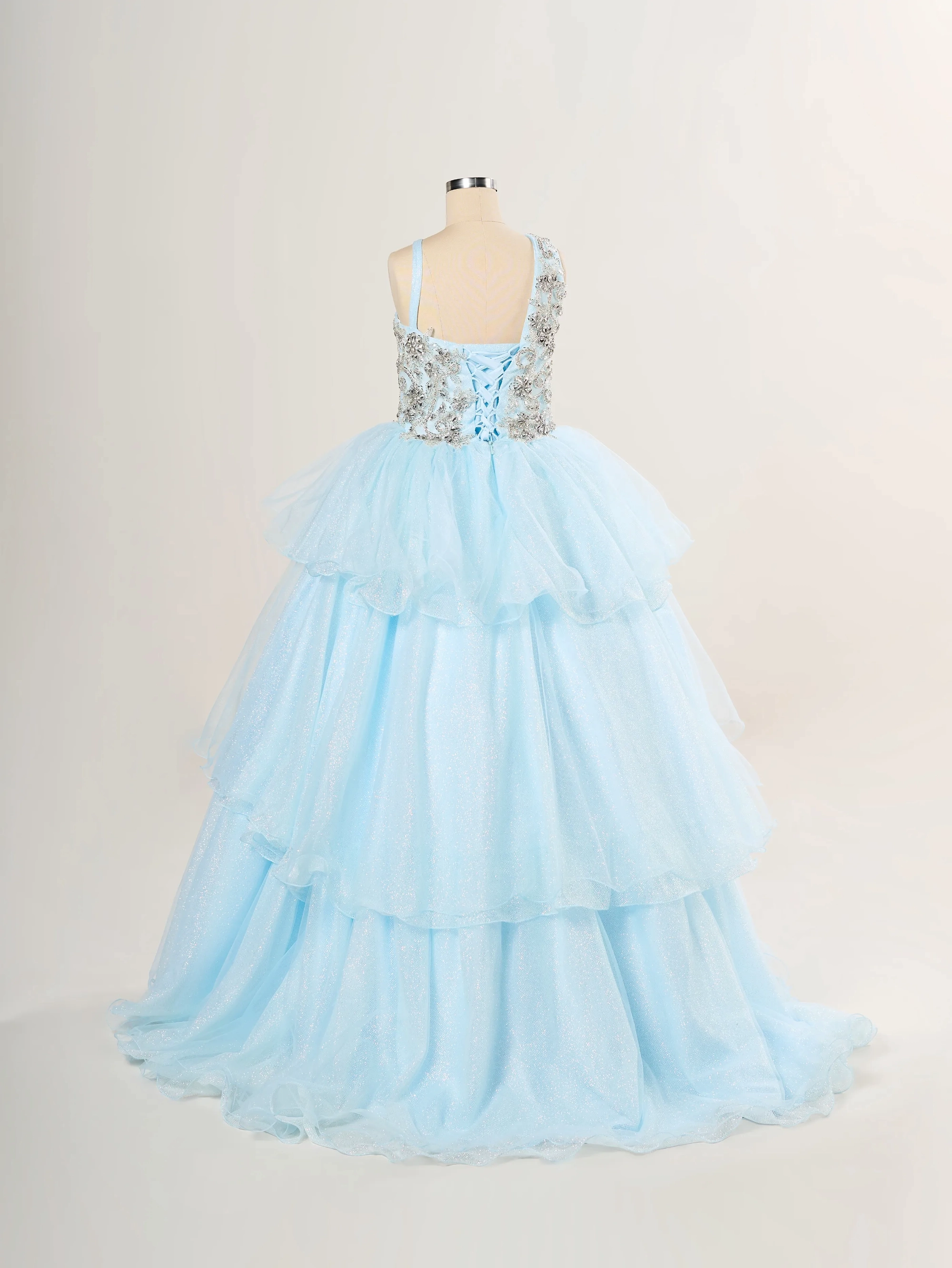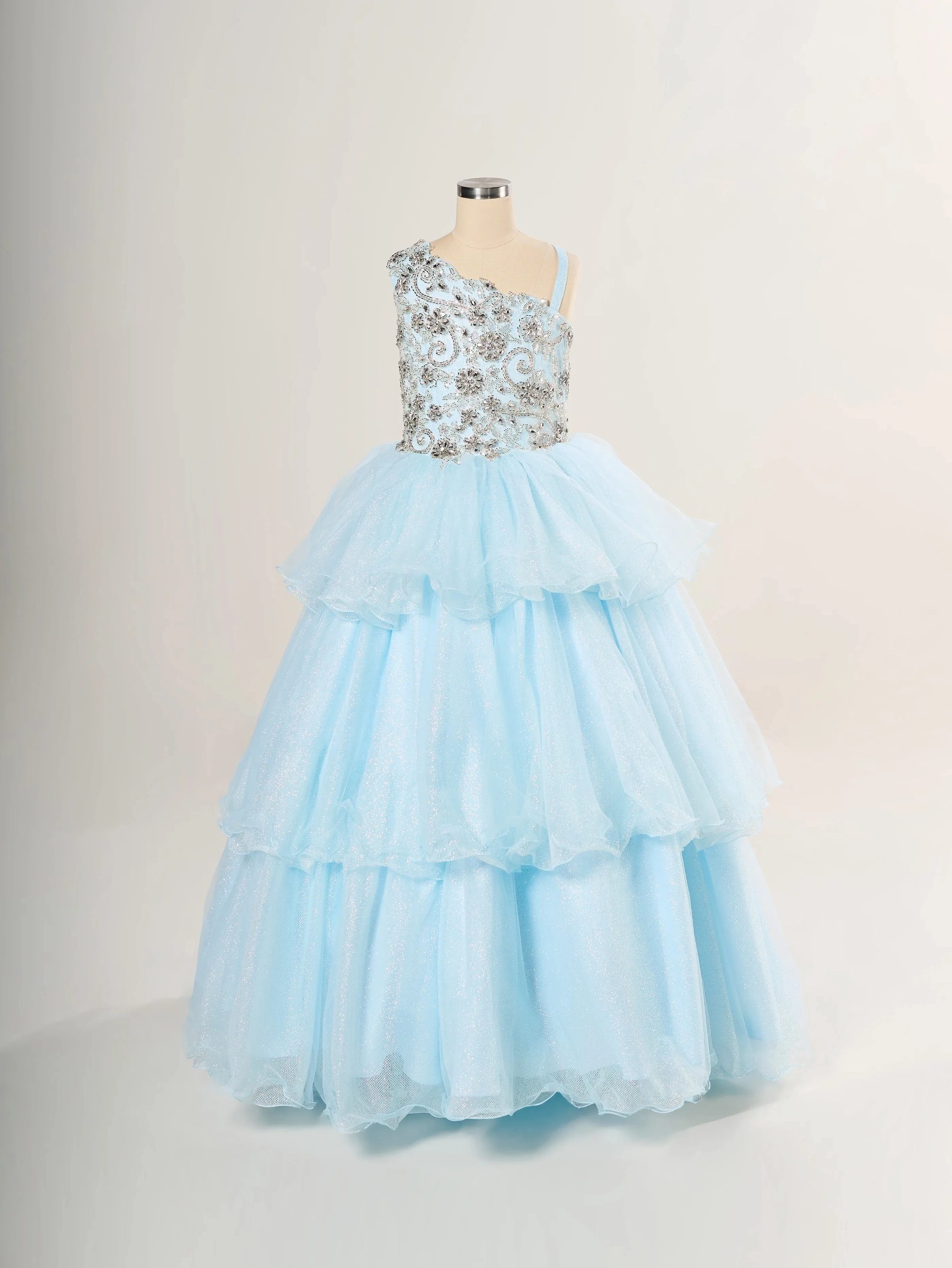 Gorgeous hand beaded glass on this one shoulder gown with a layered tulle skirt.