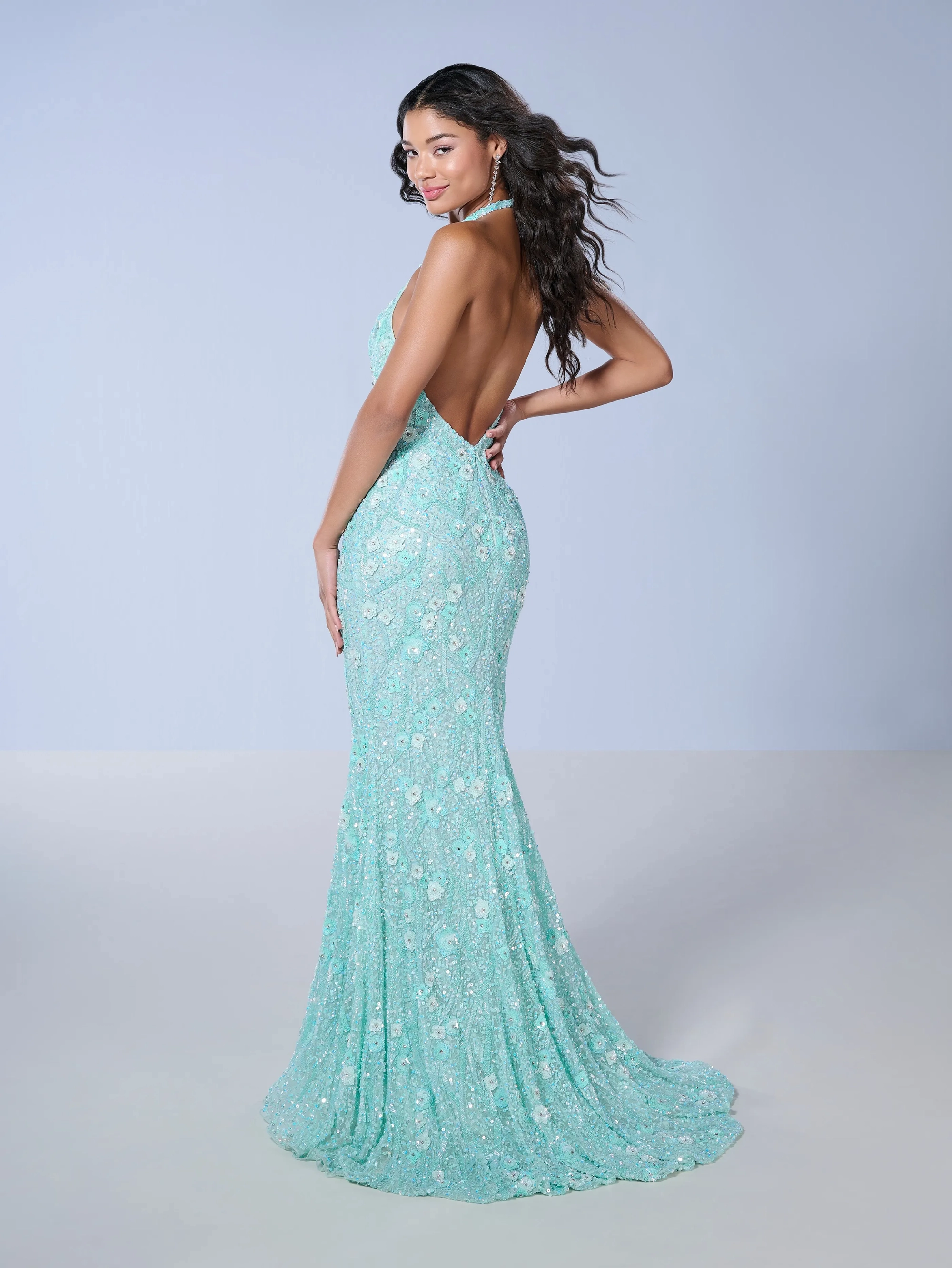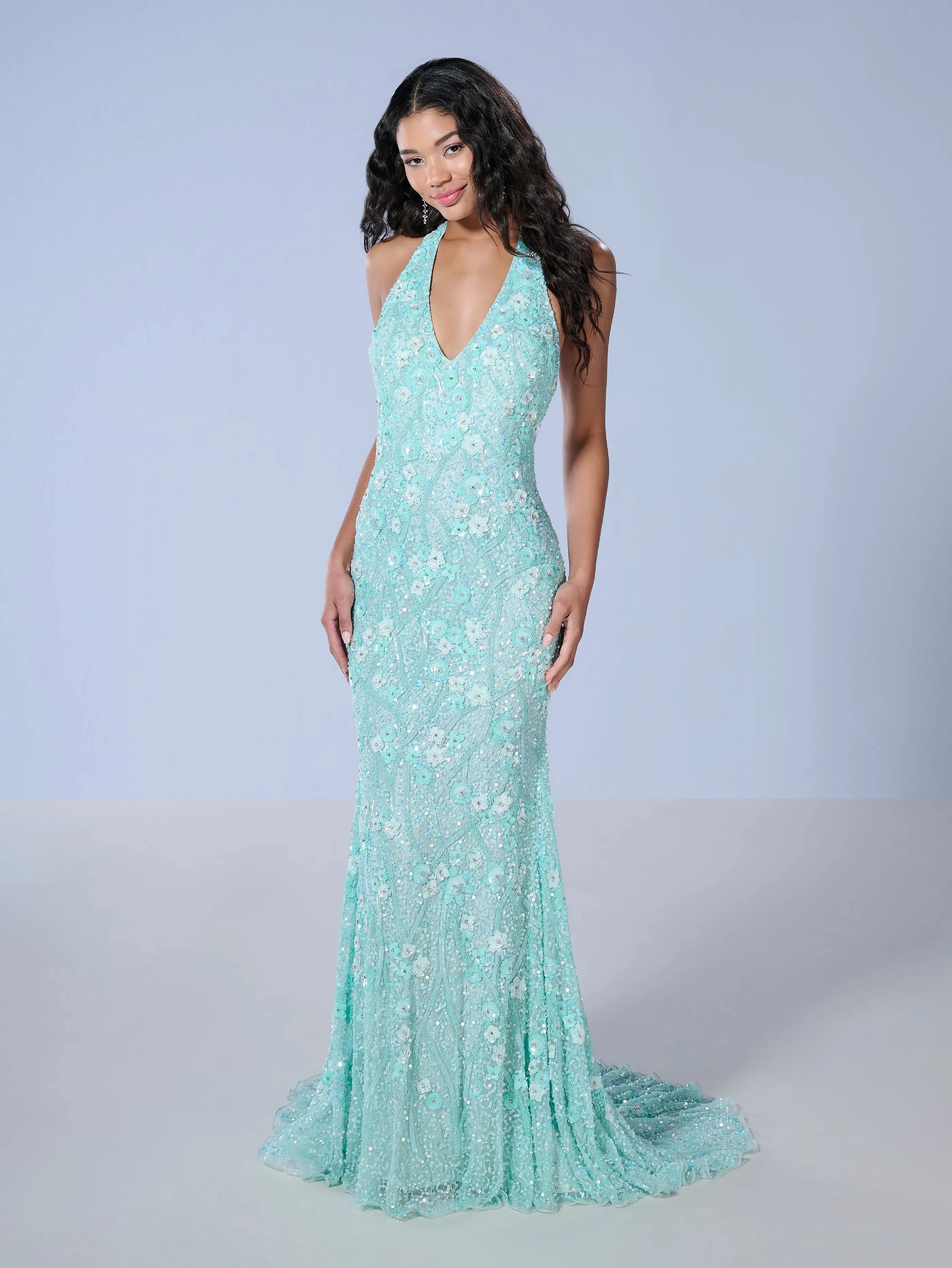 Fit and flare gown crafted from exquisite floral dream beaded mesh, featuring a sleeveless halter v neckline and subtle train for added elegance.