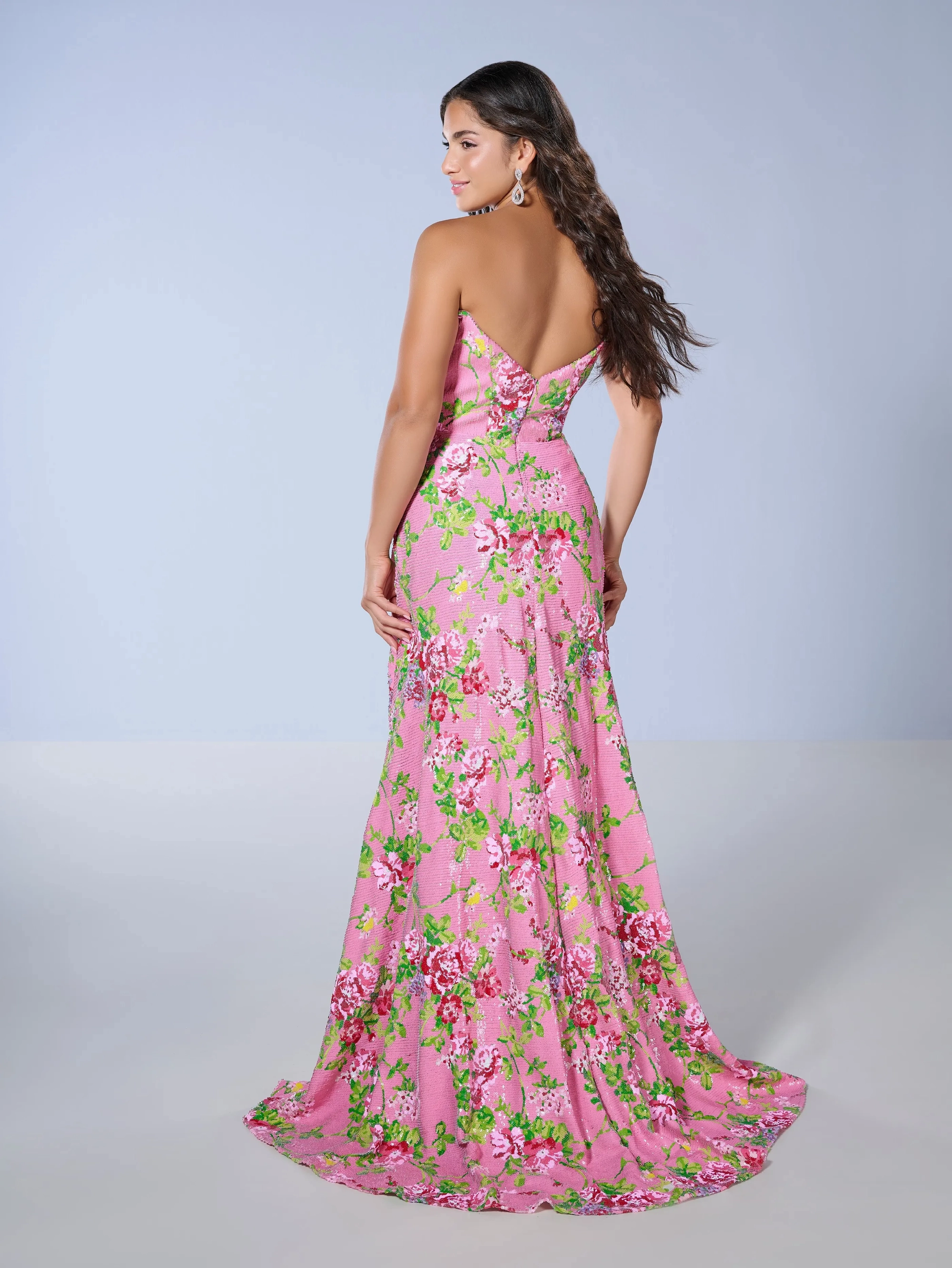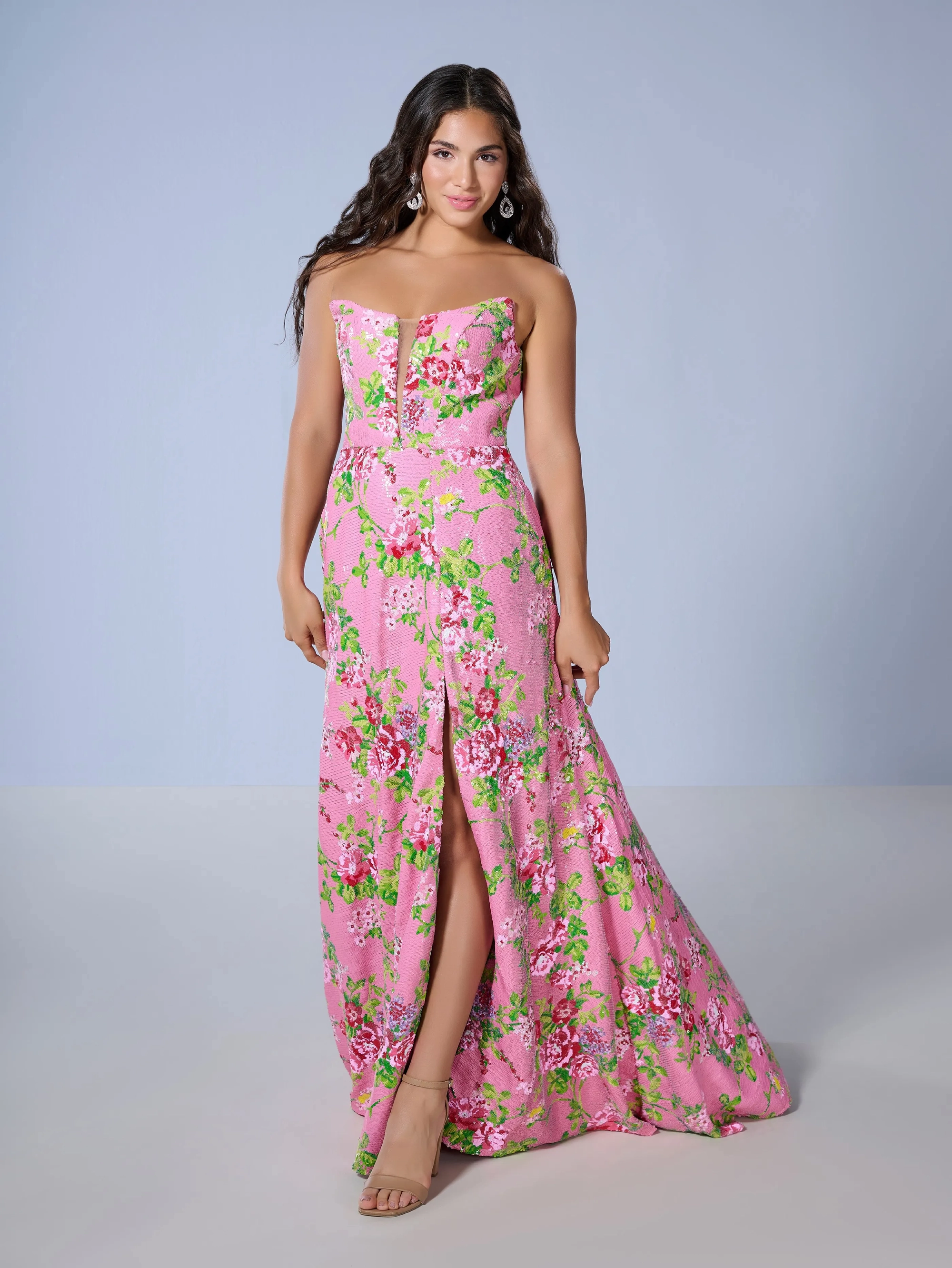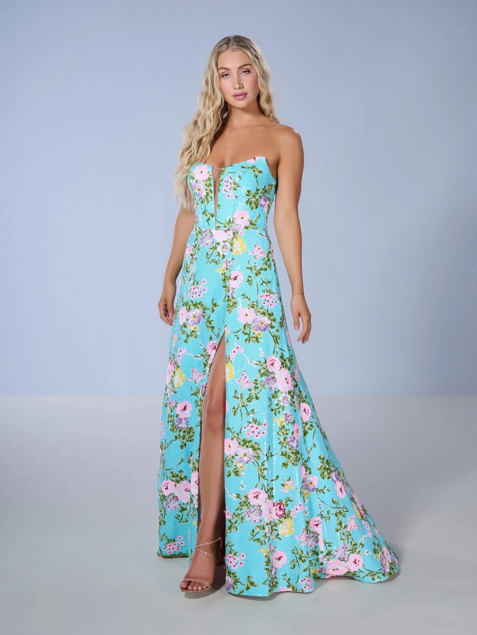 A-line gown crafted from floral sequin mesh, boasting a sleeveless deep v illusion neckline that exudes modern sophistication, complemented by a subtle train for a touch of romance.