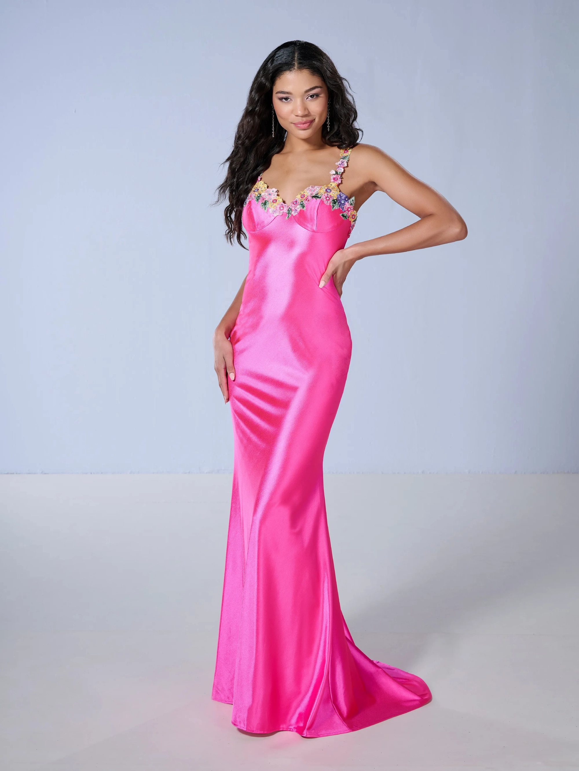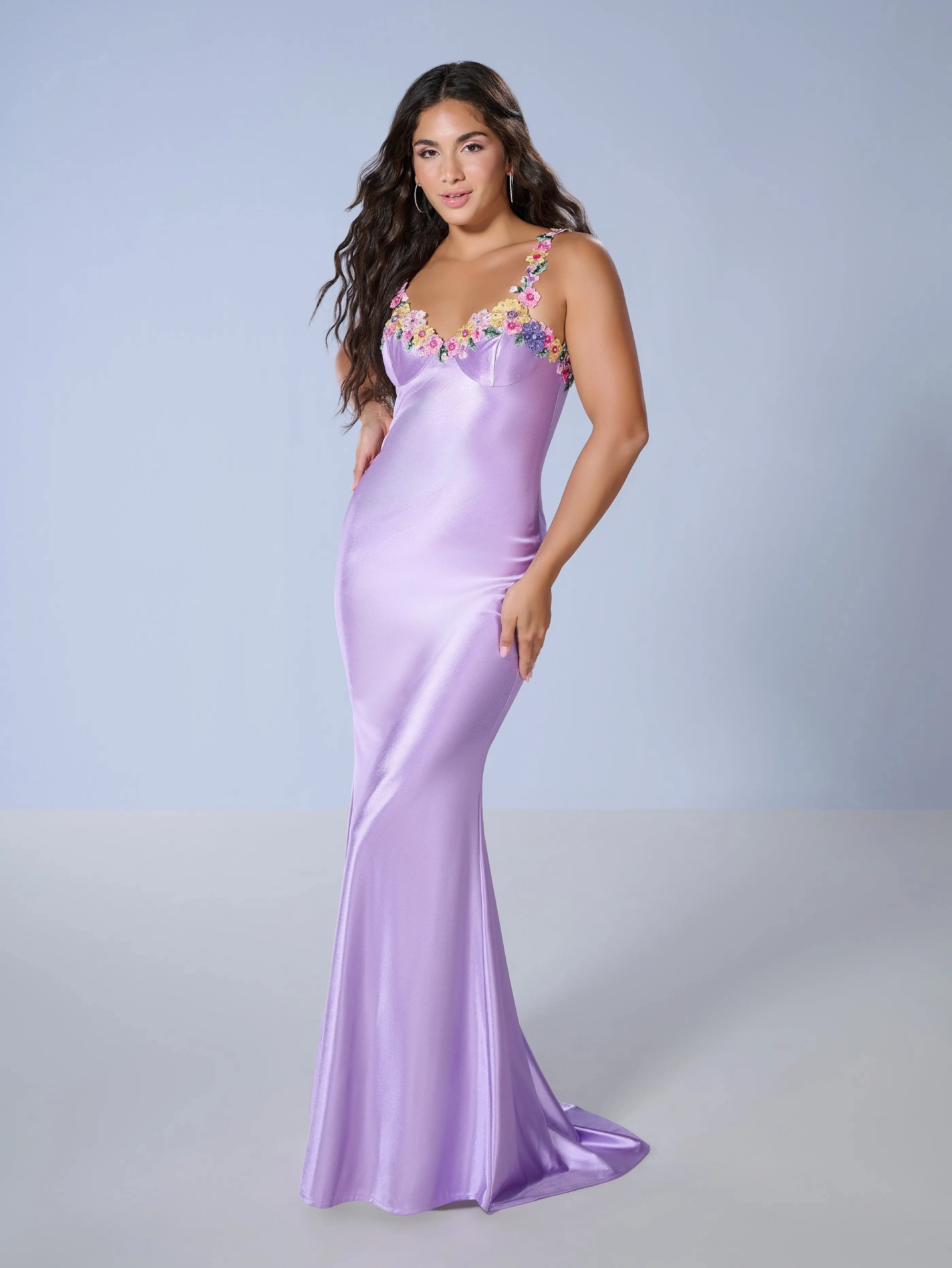 An embroidered tank strap accentuates this slim-fit gown crafted from luxurious jersey material, offering a sleek and flattering silhouette.