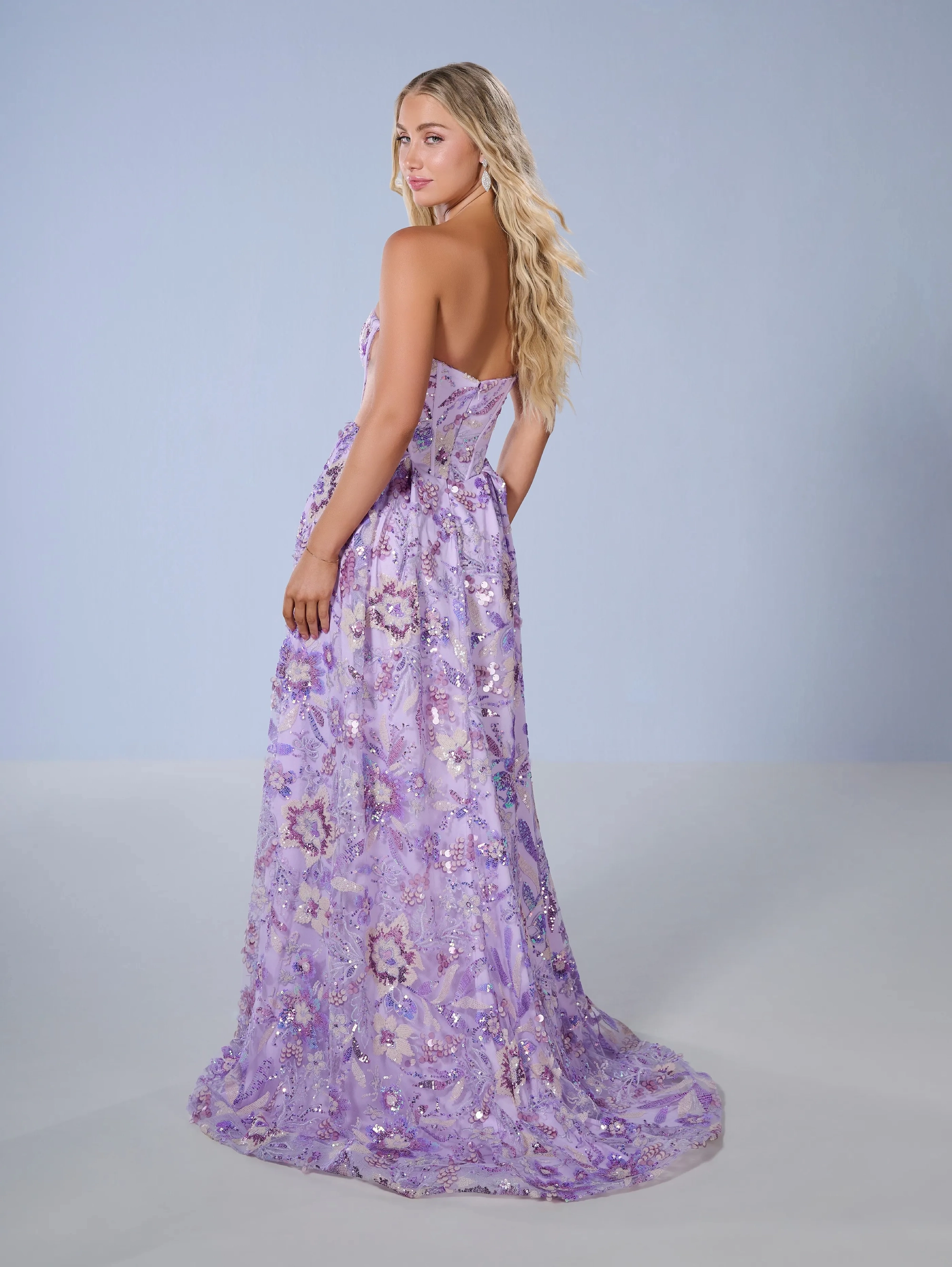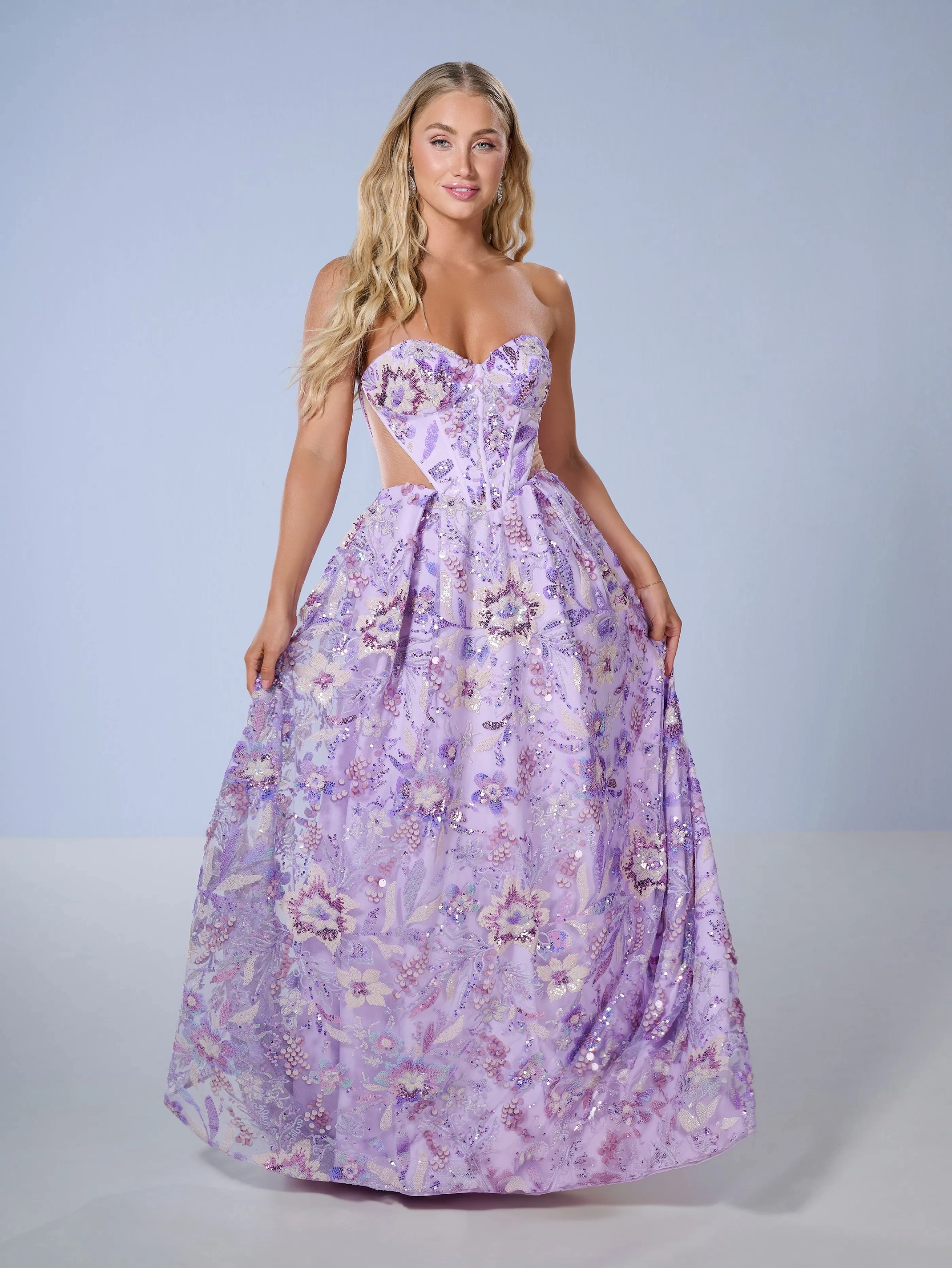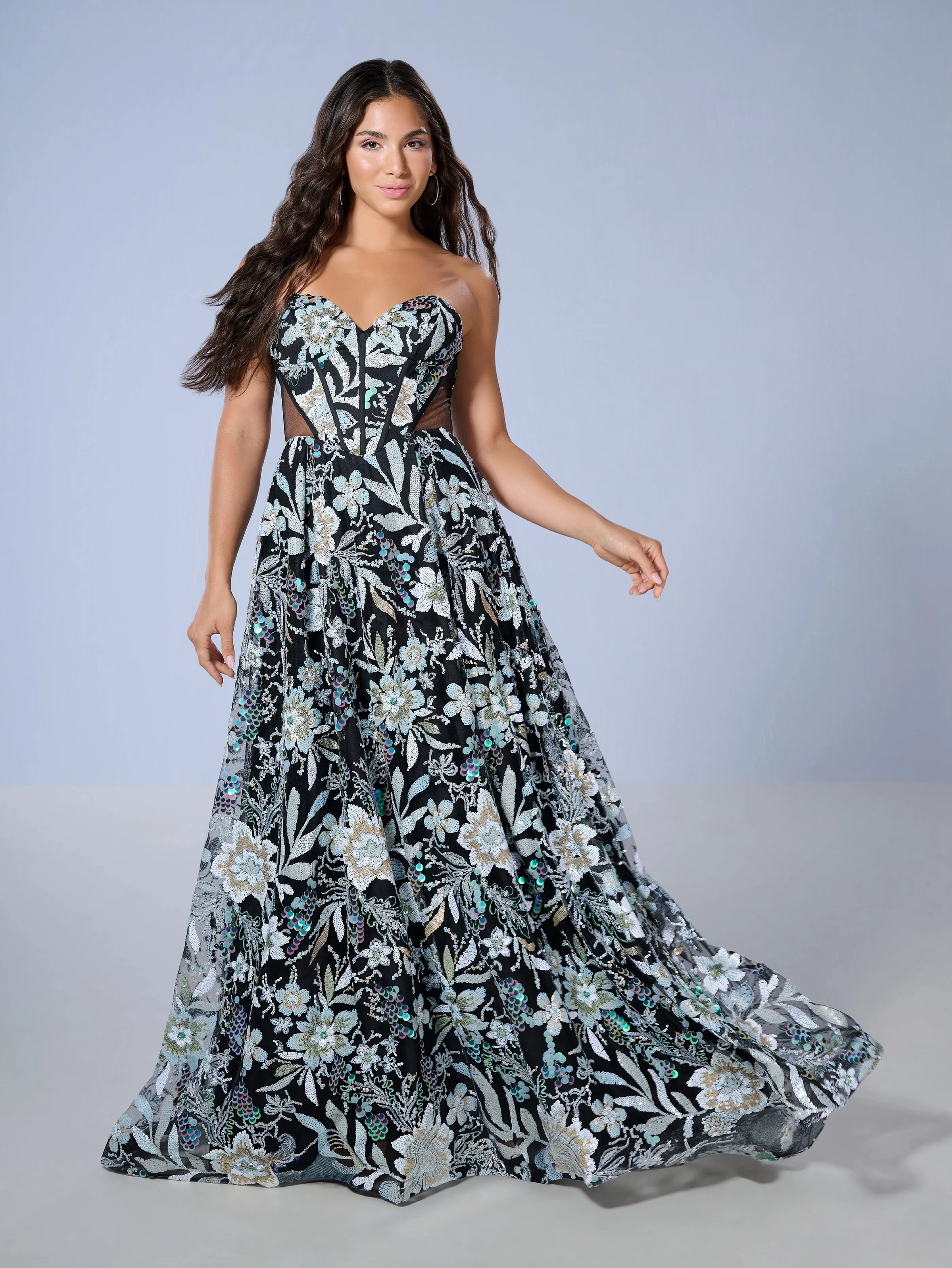 This is a beautiful strapless A-line fitted gown made out of floral garden sequin tulle with illusion cutouts.