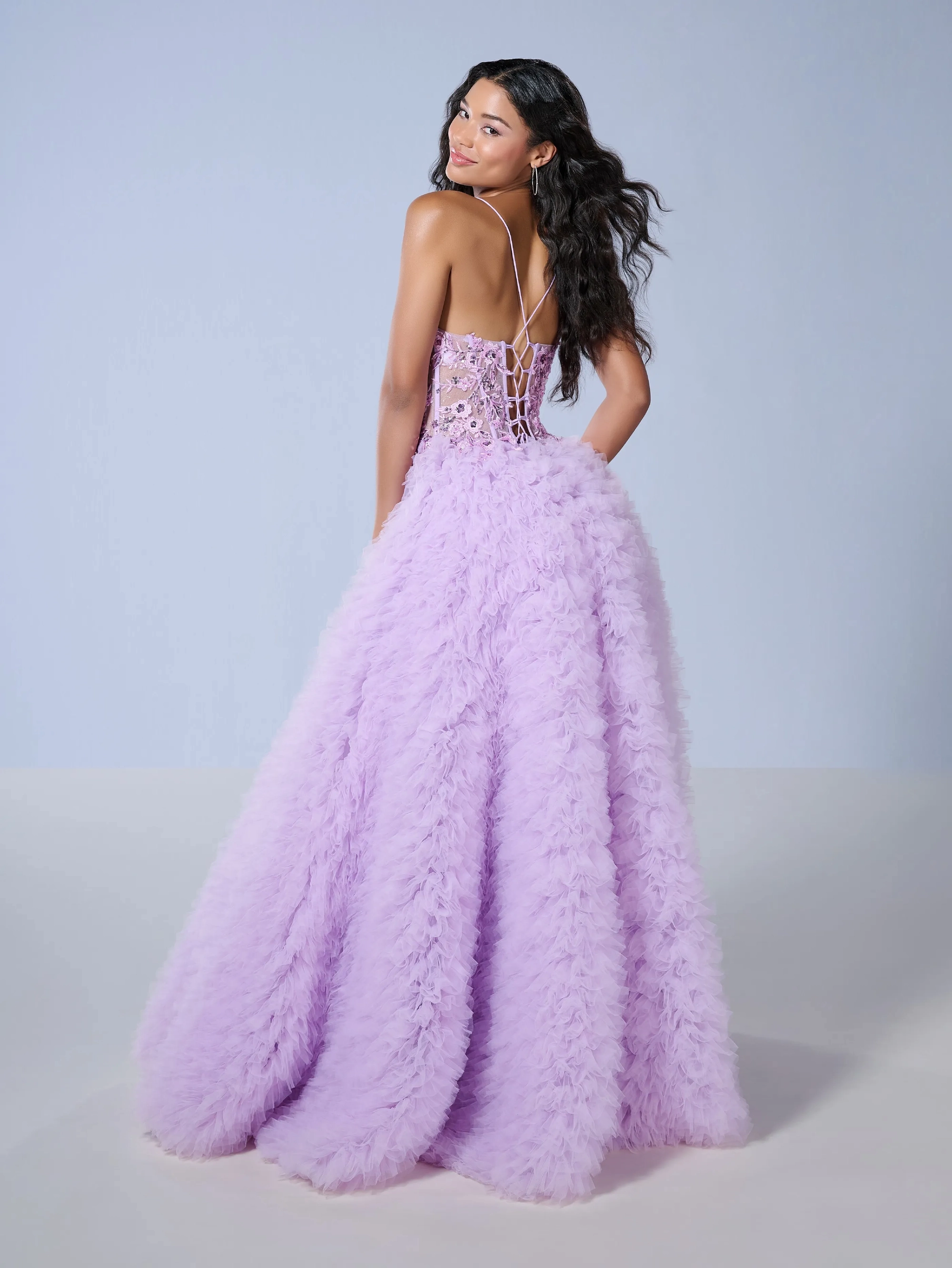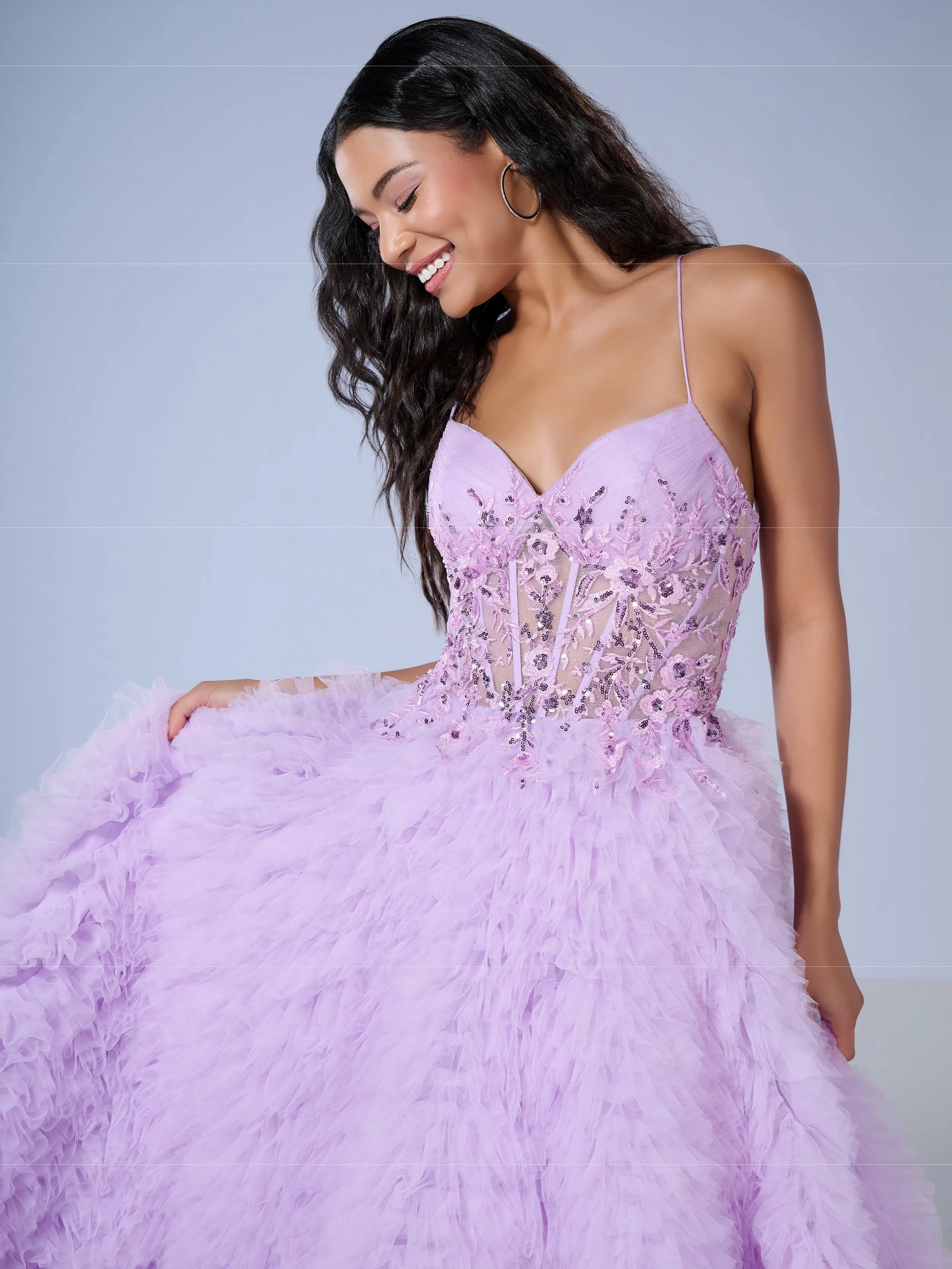 This beautiful ruffled tulle ball gown features a sleeveless sweetheart appliqué bodice and slight train.